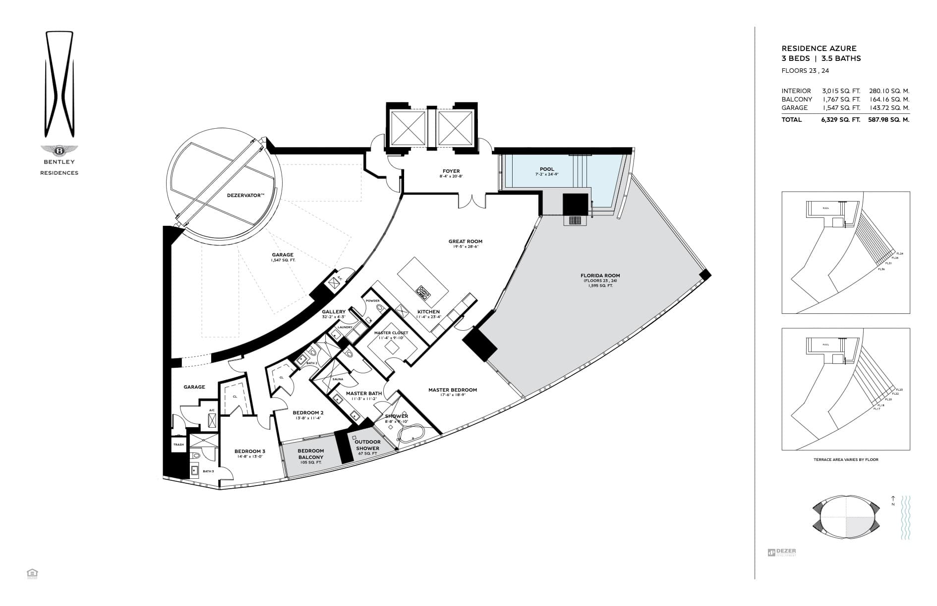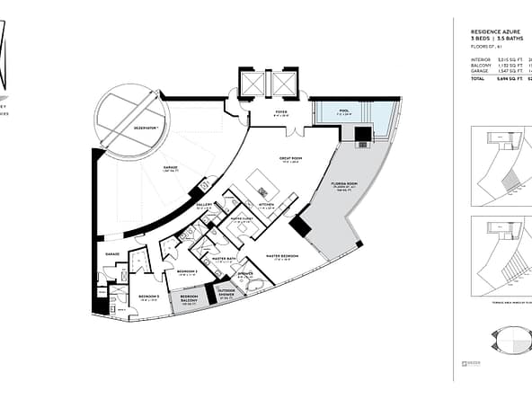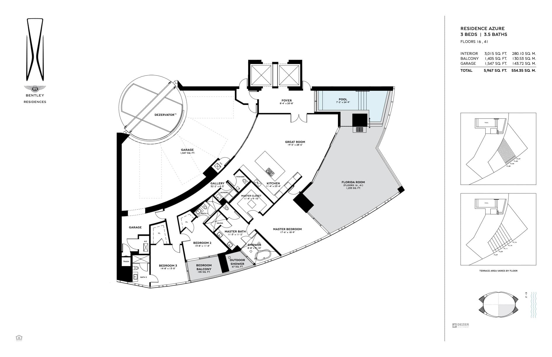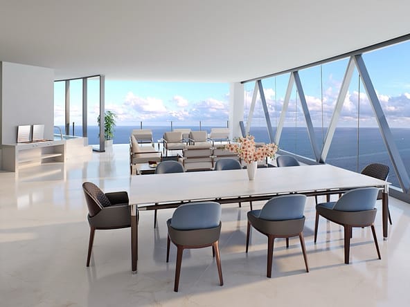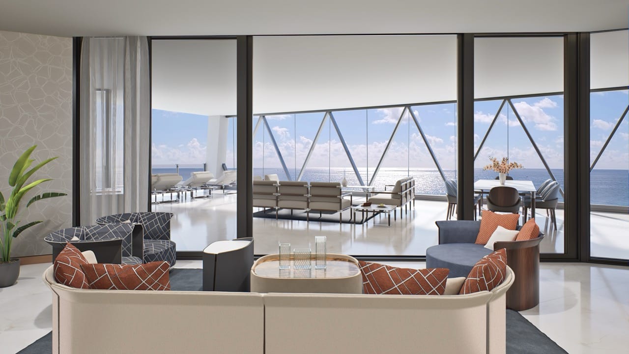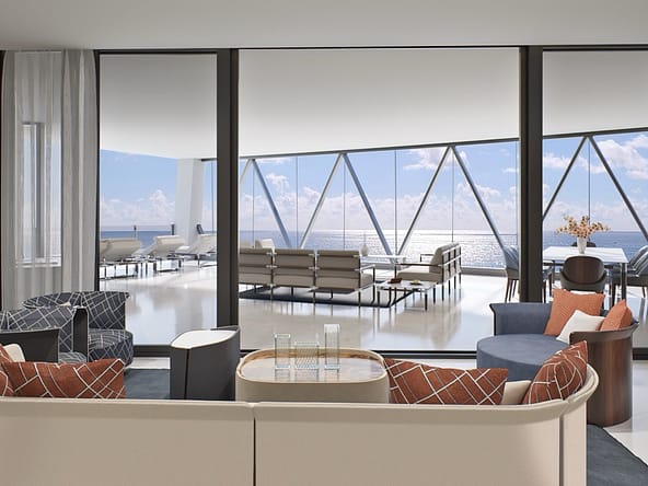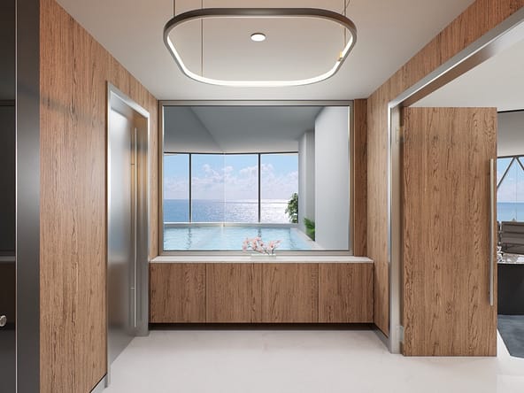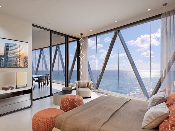 The tower offers of 216 luxury residences, including 3-bedroom apartments with private pools on outdoor terraces and views of the Atlantic Ocean. The interior design was created by Bentley Motors studio. Exquisite furniture and custom-made decor create a comfortable and stylish space for living. Distinctive features of the complex are private car halls at each level, with Dezervator glass elevator system for cars lifting.
