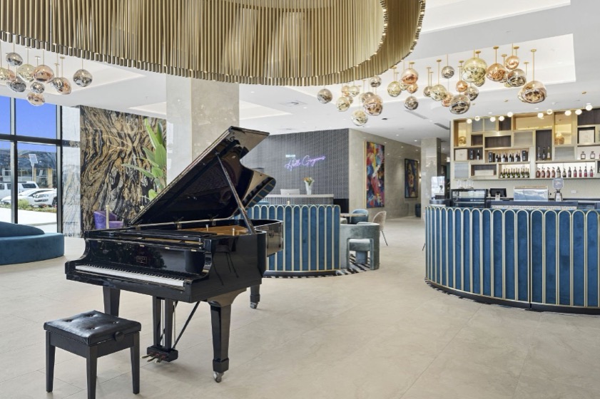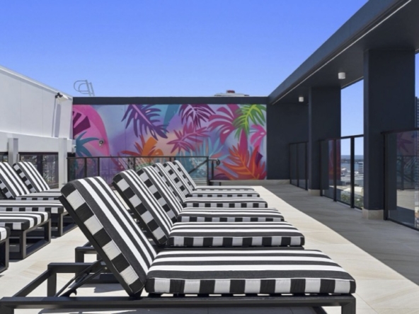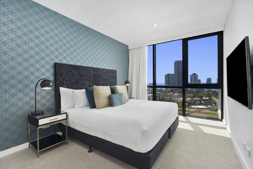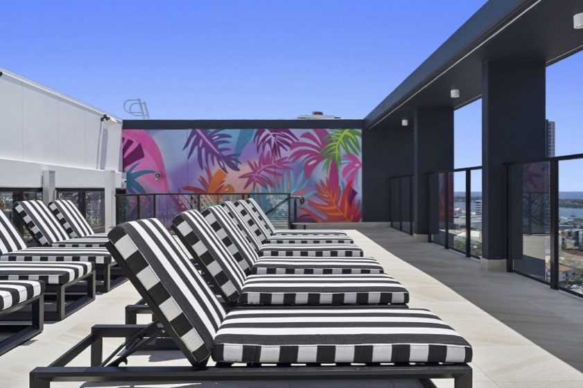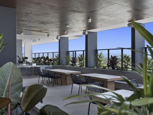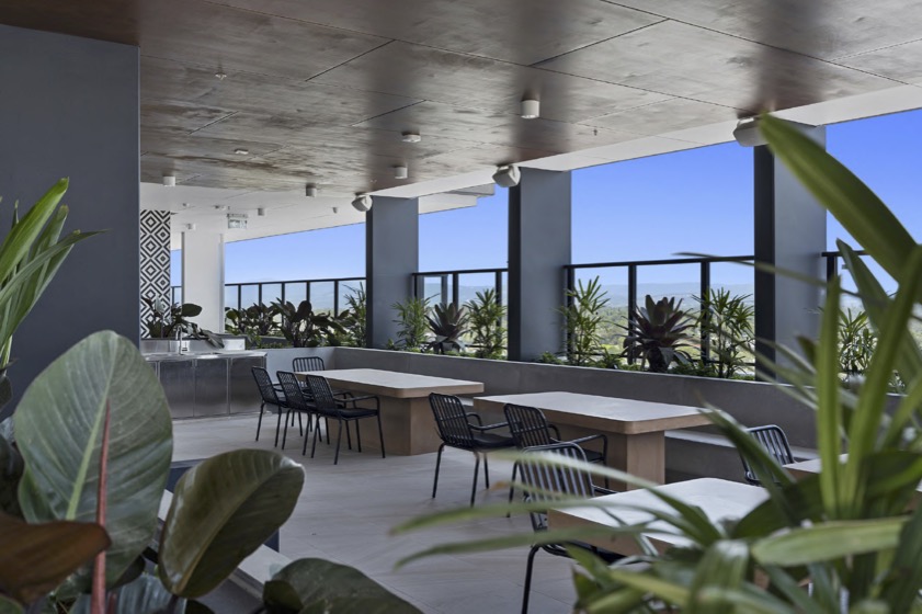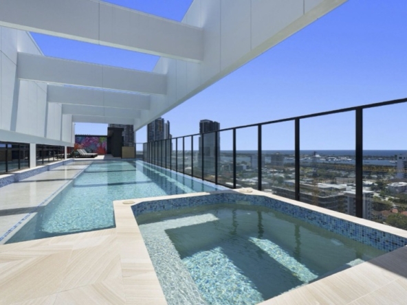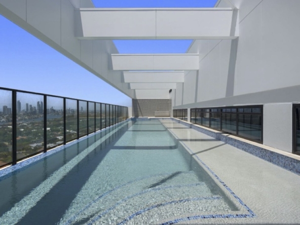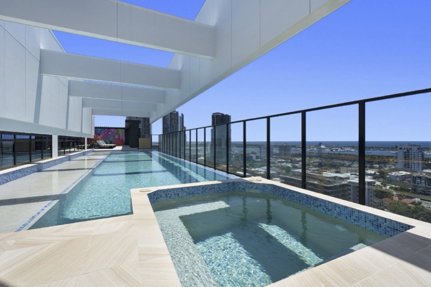 The rooftop infinity pool offers panoramic views of the Gold Coast and Hinterland.