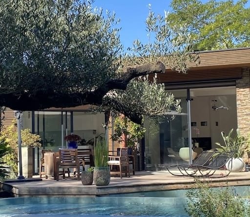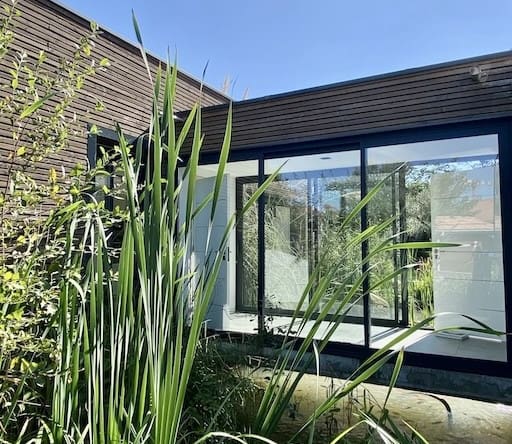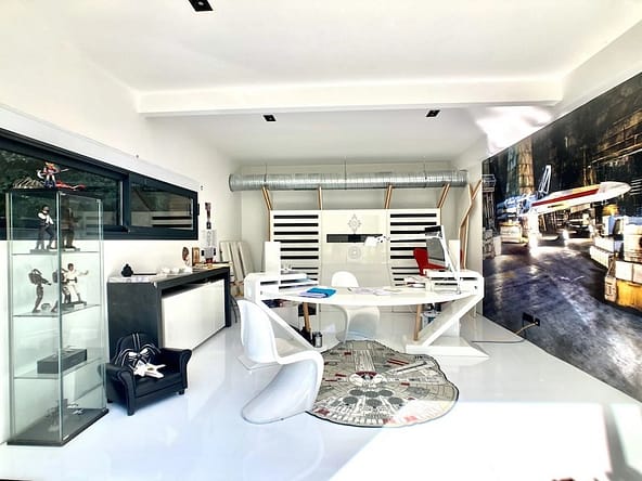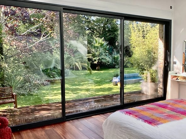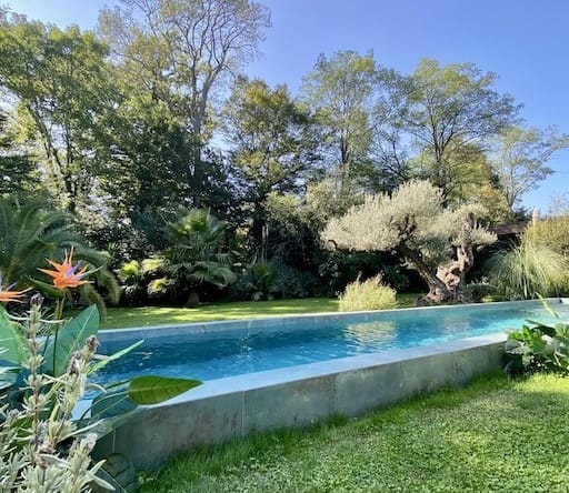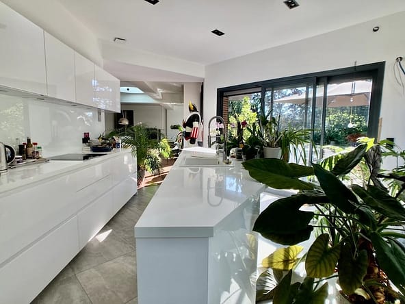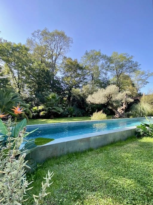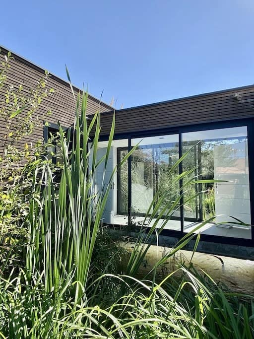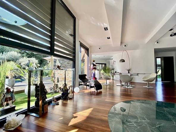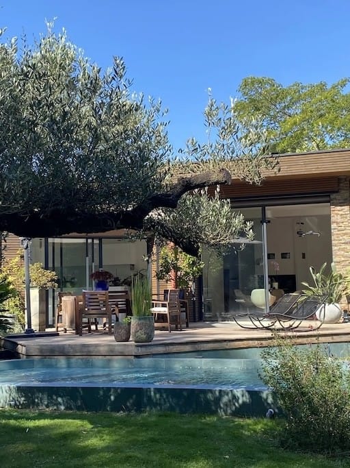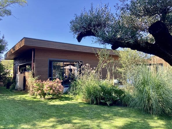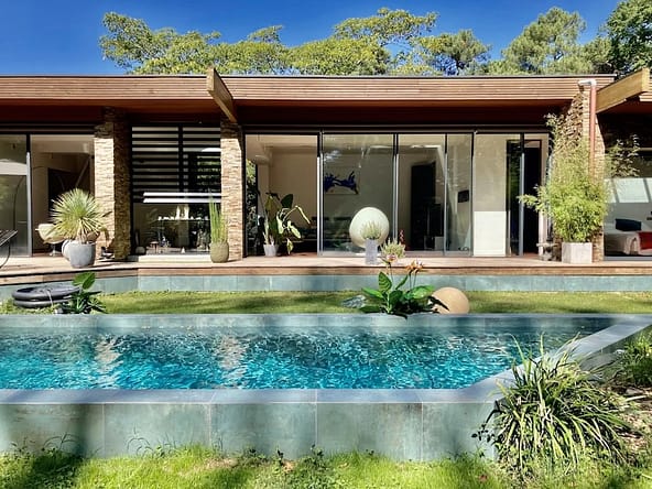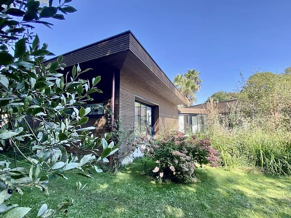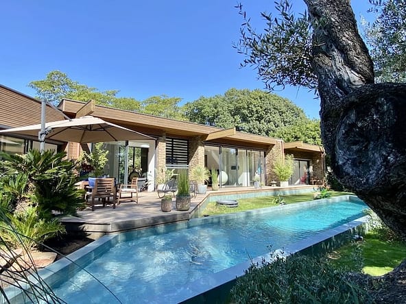Nestled in a surrounding oasis of greenery with very Mediterranean species, this magnificent new architect's house of approximately 300sqm on one level offers a truly exceptional experience.Built with high-quality materials, it was designed according to the rules of the golden ratio widely used in architecture and design (Vinci, Le Corbusier) and the principles of geo-biology, thus respecting and optimizing the proportions of spaces and natural energy flows.Facing south, its large Ip terrace immerses you in a large, very protected landscaped garden. Its long swimming pool with emerald reflections plays with the light , responding to the century-old olive trees.Designed by a renowned architect for the needs of his family, the house now offers a very large living/dining room of almost 100m2 with a wide fireplace, an open-space kitchen of 27sqm, all opening onto the garden by large bay windows.In its current configuration, the house accommodates 3 bedrooms, 2 shower rooms and a bathroom, but can be reconfigured to accommodate two large bright additional bedrooms and a shower room on the same level.A garage of 50sqm, a gaming room, a laundry room, a workshop and many storage spaces complete this remarkable ensemble in which particular care has been taken at each stage of the design.Ideal for a family with its large spaces opening onto the garden, this house also lends itself to a liberal profession or any other variation of home office, enabling to organise your professional life very comfortably.Our opinion: a high-quality setting in a very private and very well-connected environment. High-end and sustainable construction, design and materials. All the dimensions of a house have been thought out and intelligently implemented. Bordeaux Airport in 10 min.