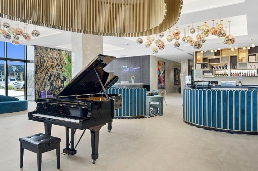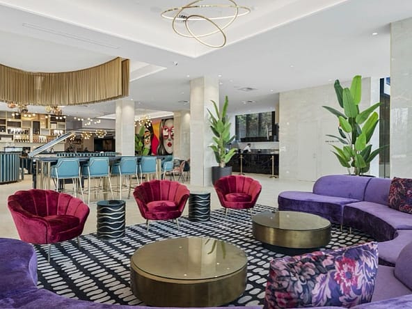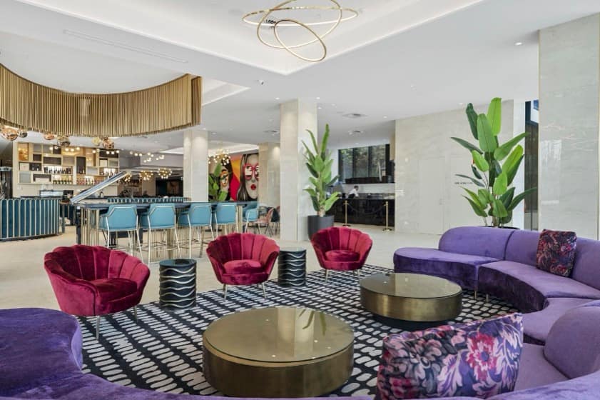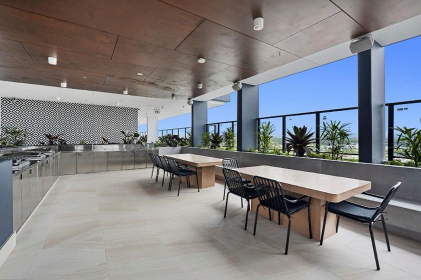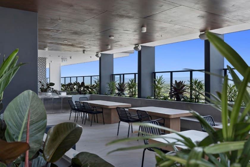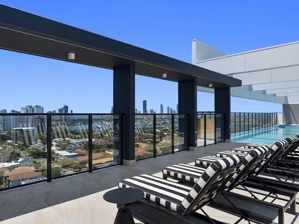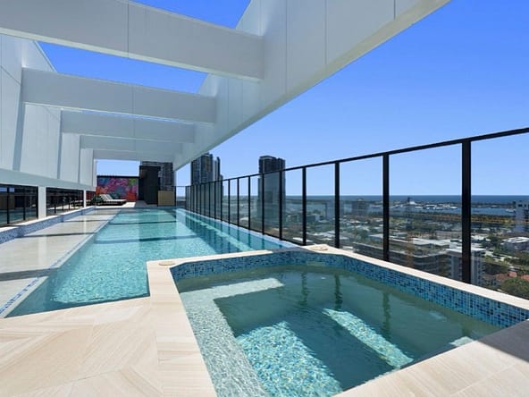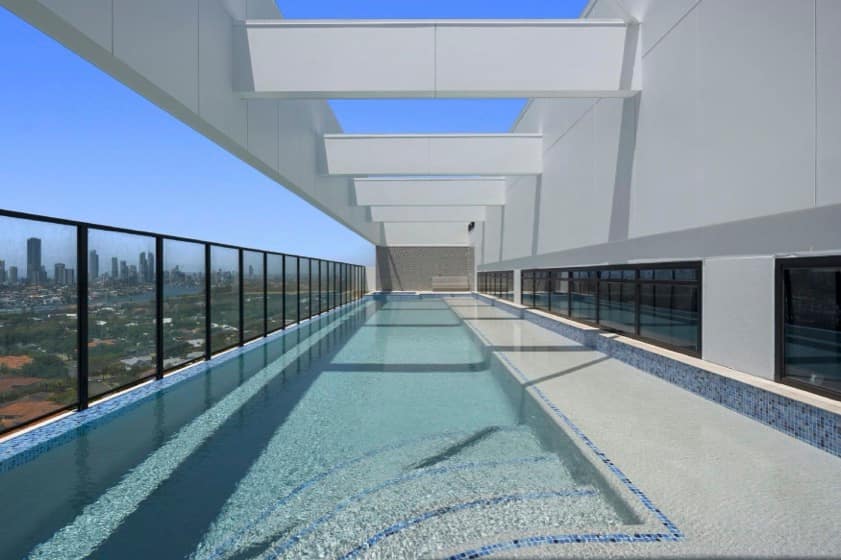 The rooftop infinity pool offers panoramic views of the Gold Coast and Hinterland.