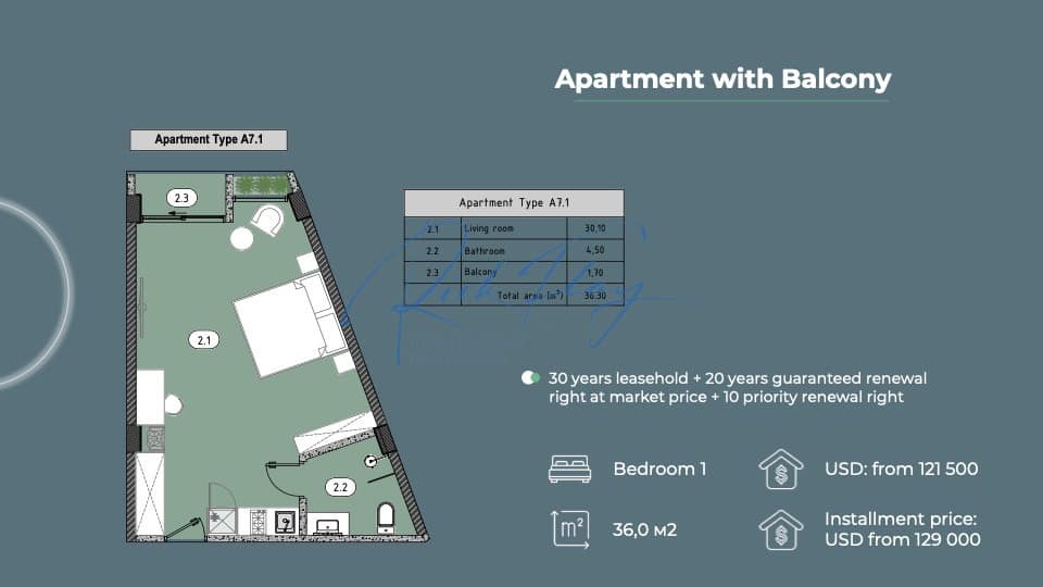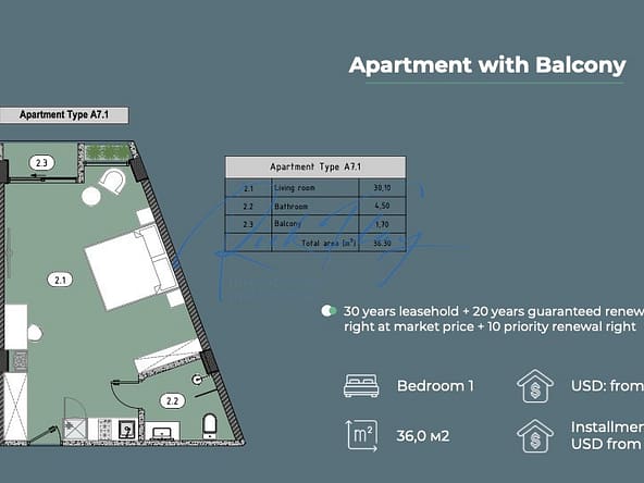 Apartment with Balcony – 1 Bed / 1 Bath | 36.0 sqm | From $121,500 USD