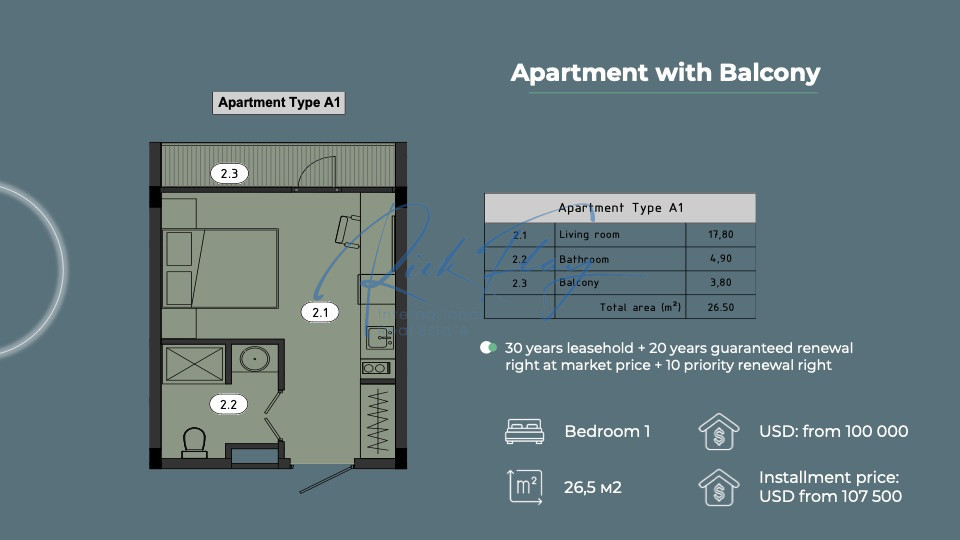 Apartment with Balcony – 1 Bed / 1 Bath | 26.5 sqm | From $115,000 USD