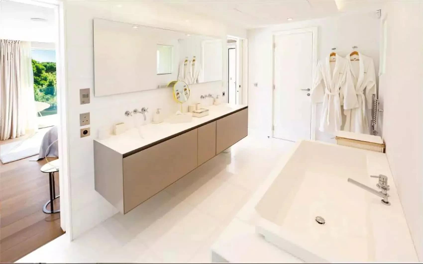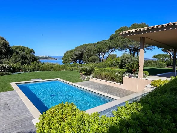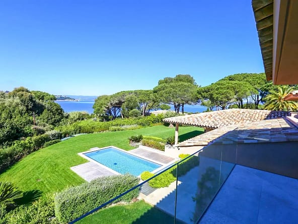 Located in the prestigious private estate Les Parcs de Saint-Tropez, this contemporary villa offers complete privacy and panoramic views of the Gulf of Saint-Tropez. Set in a peaceful, secured environment with 24/7 surveillance, residents enjoy exclusive access to tennis courts, a private beach, and a resident caretaker.The villa spans approximately 500 m² and sits on a magnificent 1-hectare landscaped garden with a vast pine forest behind and no vis-à-vis. A brand-new 17m x 5m swimming pool (2024) enhances the outdoor experience.Layout:• Garden level: Expansive living room opening onto the pool terrace, modern fitted kitchen with dining area, 5 bedrooms each with en-suite shower rooms and terrace access.• Upper level: Exclusive master suite with bathroom, office, dressing room, and two private terraces.• Lower level: Wellness area with massage room, sauna, hammam, professional kitchen, wine cellar, and 2 staff rooms.Additional features include high-end audio/video systems, surveillance cameras, alarm system, Wi-Fi, and private sea access. Parking for 4 vehicles.Areas 1 Land 9600 m² 4 Outdoor parkings 1 Equipped kitchen professional 1 Exercise room massage room 1 Sauna 1 Steam room 1 Wine cellar 1 Laundry room 1 Living room/dining area 1 Equipped kitchen 1 Dining room 1 Lobby 4 Bedrooms 4 Shower rooms / Lavatories 1 Lavatory 1 Terrace 1 Suite 1 Office 1 Walk-in wardrobe 2 Terraces 1 BathroomProximities Town centre 10 minutes Sea 50 metres Beach 10 minutes Tennis 5 minutes