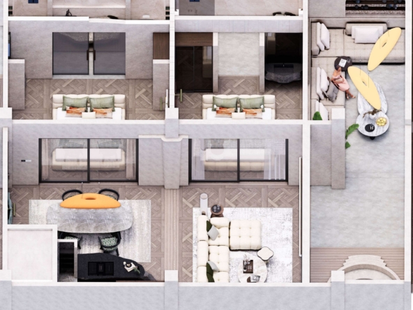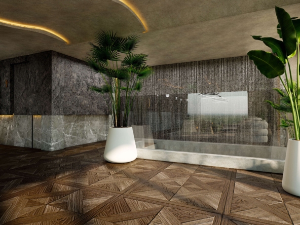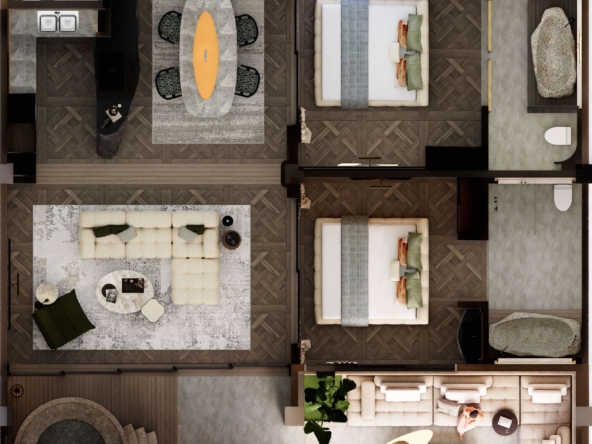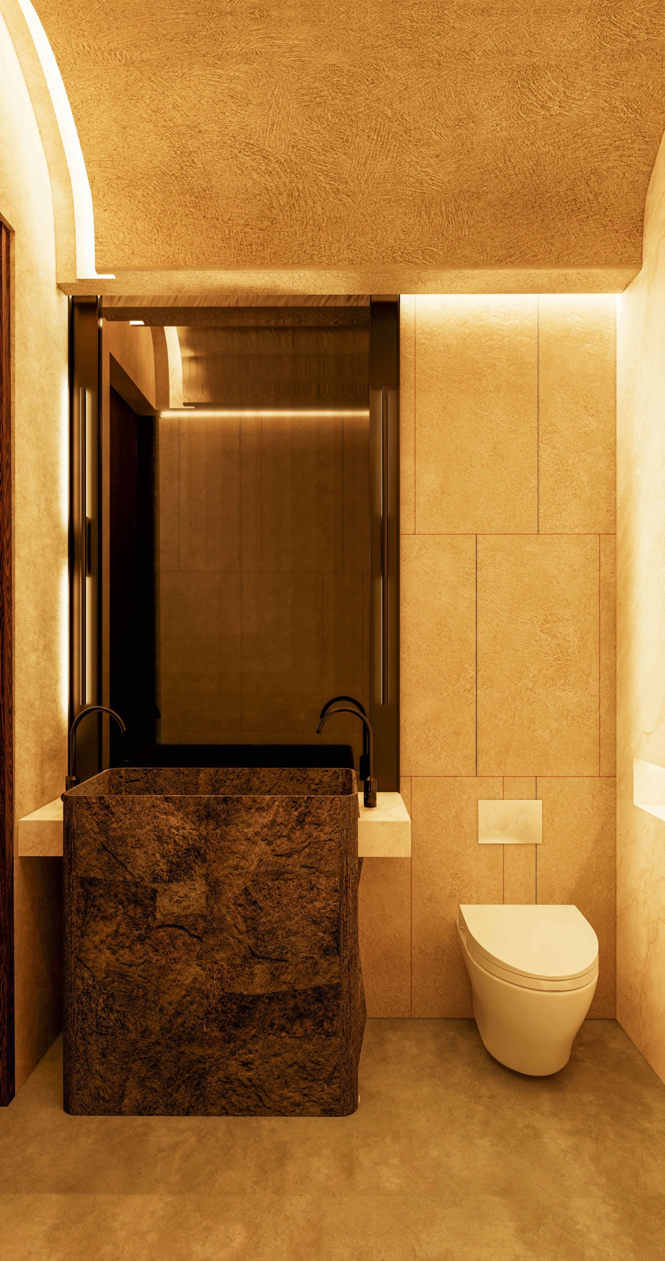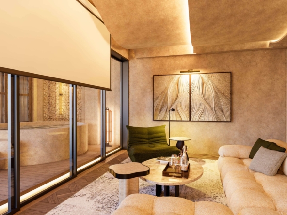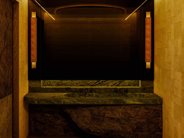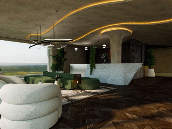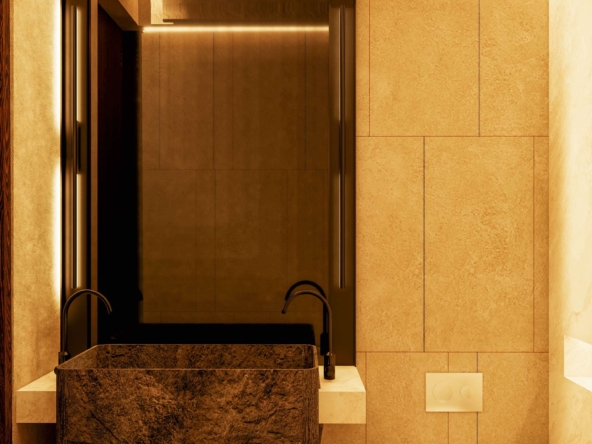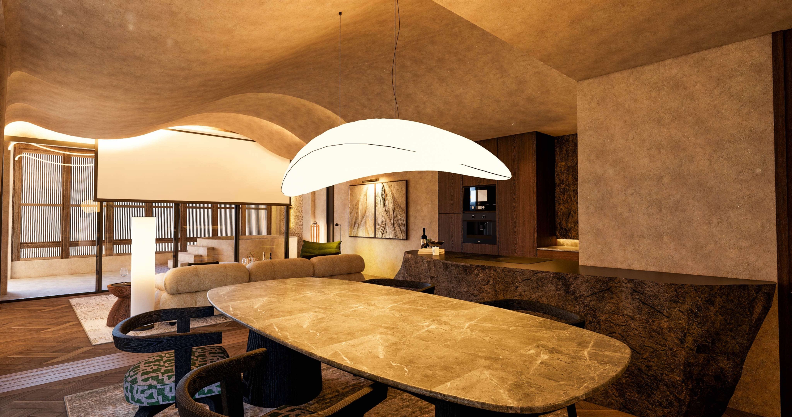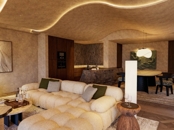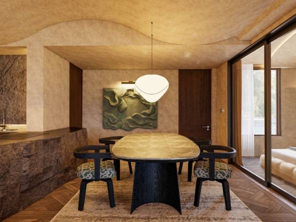 The design philosophy focuses on timeless elegance — natural woods, stone textures, and warm earthy tones create a calm and sophisticated ambiance that preserves its value over time.