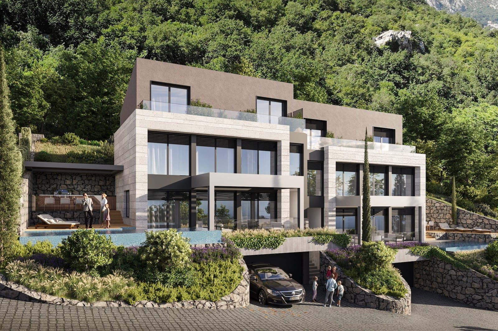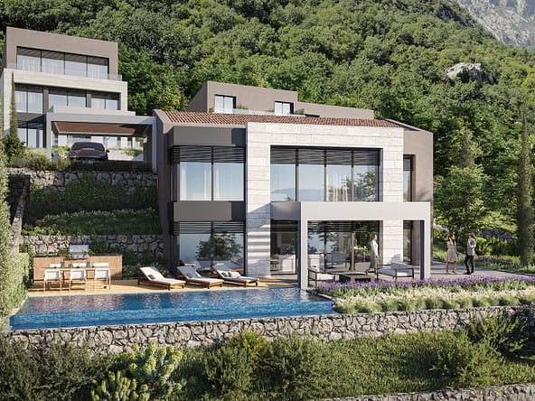 4-Bedroom Modern Villa in Dobrota, Kotor BayA luxurious 4-bedroom villa under construction in an exclusive villa community in Dobrota, offering stunning panoramic views of Kotor Bay, the Adriatic Sea, and surrounding mountains.Set on a 447 m plot, this modern villa features a heated infinity pool, a patio with al-fresco dining and outdoor shower, and covered parking for two cars. The villa spans three levels:Basement: 3 technical rooms that can serve as a gym, wine cellar, or laundry area.Ground Floor: spacious living room, fully equipped Italian-design kitchen with quartz countertops, dining area, guest bedroom with ensuite, guest toilet, and access to the pool and patio.First Floor: 3 bedrooms, 2 with ensuite bathrooms, 1 with walk-in wardrobe, and a hallway.Built with premium materials, the villa includes high-end flooring and tiles, fully fitted bathrooms, top-tier appliances (Bosch, Miele, or equivalent), and electric underfloor heating.The developer offers flexible, interest-free deferred payment plans up to 4 years, with only 20% downpayment.This property combines modern luxury with traditional Montenegrin architecture and the areas natural beauty, offering an exclusive lifestyle close to the historic Old Town of Kotor. It is an ideal choice for both personal residence and investment, benefiting from Kotor Bays popularity, high rental potential, and strong property appreciation.