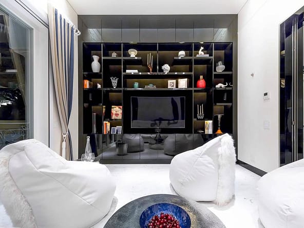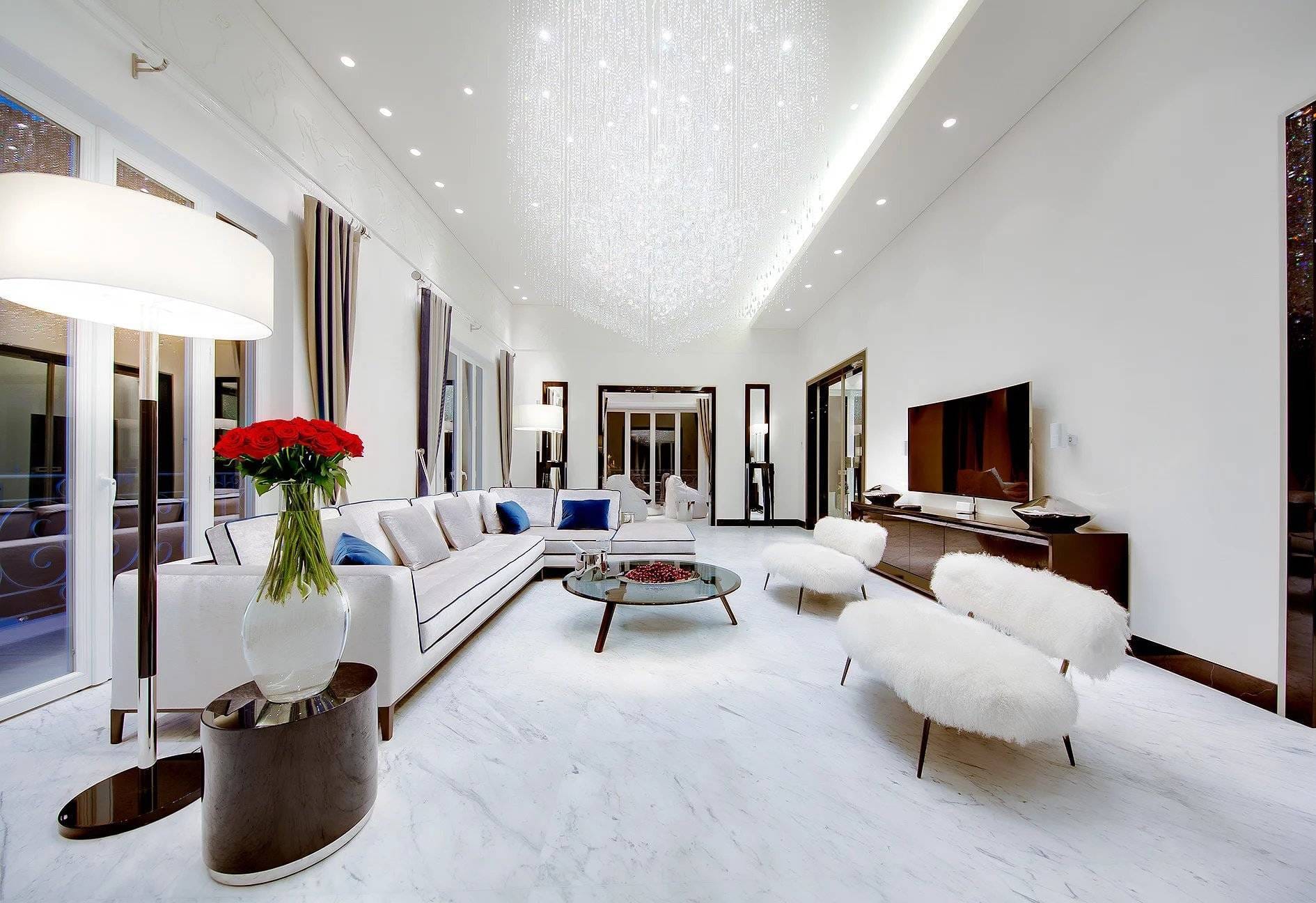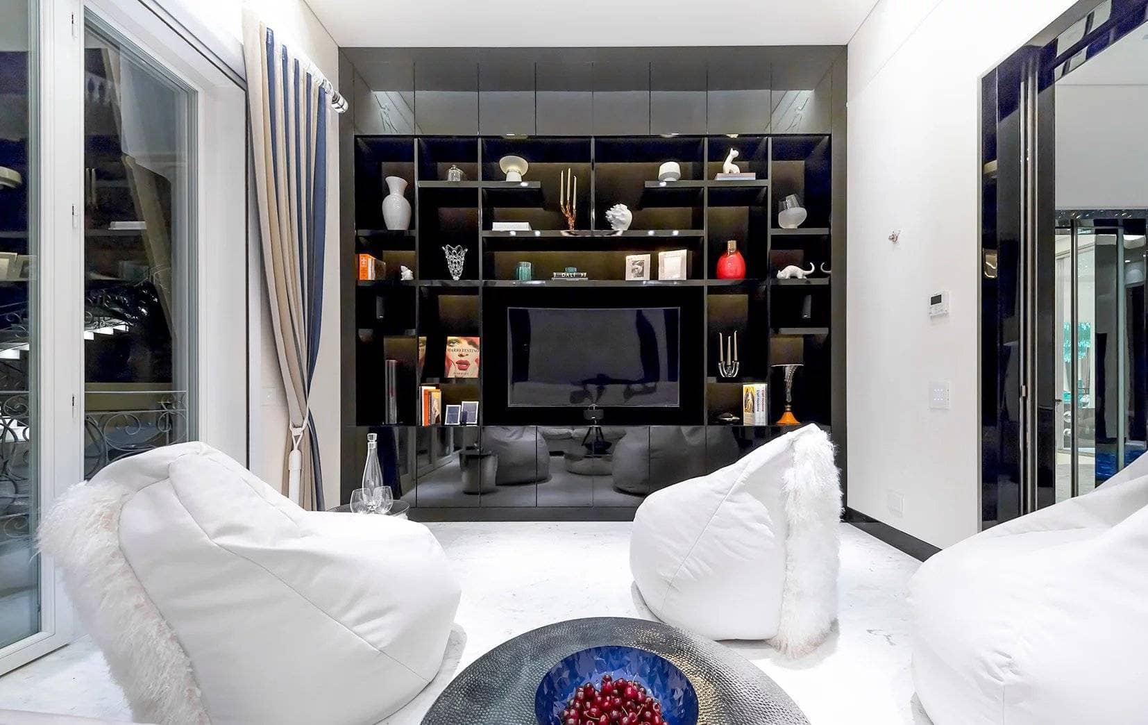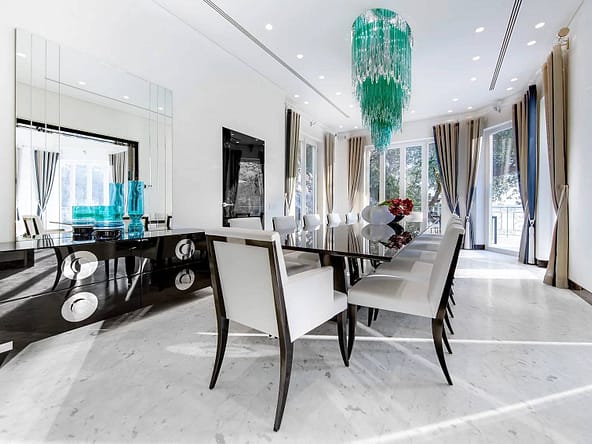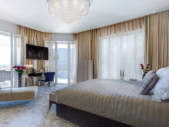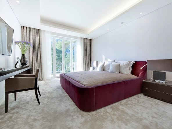 The villa includes a spacious living/dining area of about 100 m², a fully equipped kitchen, TV room, library, office, and a wine cellar. It boasts 3 master bedrooms, each with a dressing room, en-suite bathroom, and private terrace, as well as 4 guest bedrooms with en-suite bathrooms and private terraces.