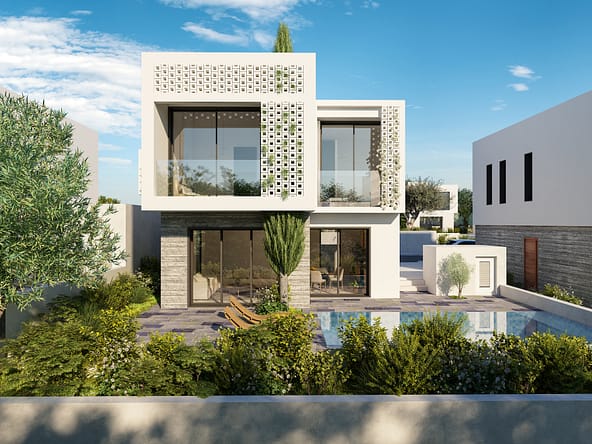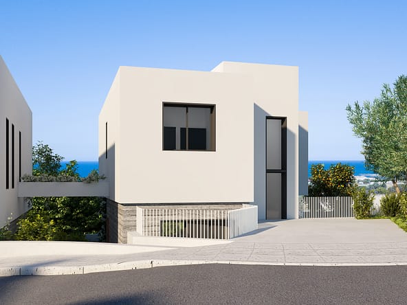 These 3-bedroom villas for sale in Paphos ingeniously blend the use of white finishes and fair face concrete, with decorative walls also featuring concrete blocks. The location is blessed with scenic views of the sea, is a short walk to the beach and is close to many local amenities.