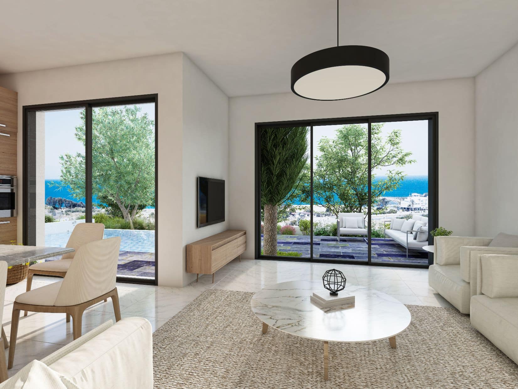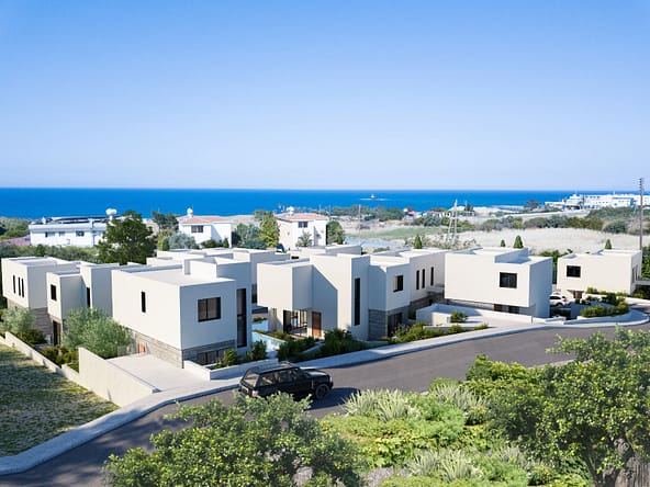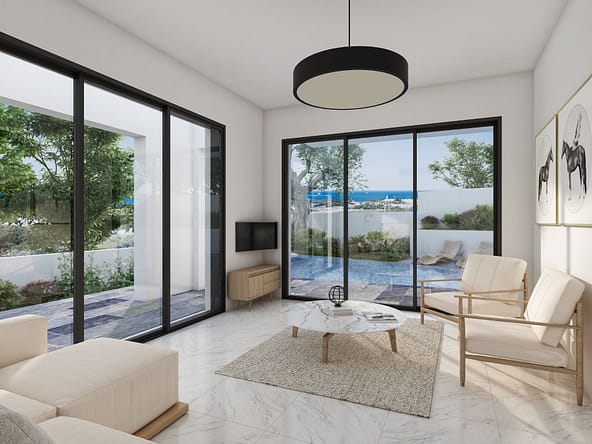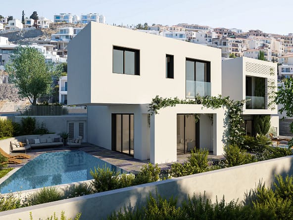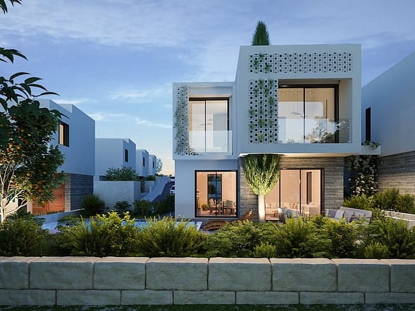 These 3-bedroom villas for sale in Paphos ingeniously blend the use of white finishes and fair face concrete, with decorative walls also featuring concrete blocks. The location is blessed with scenic views of the sea, is a short walk to the beach and is close to many local amenities.