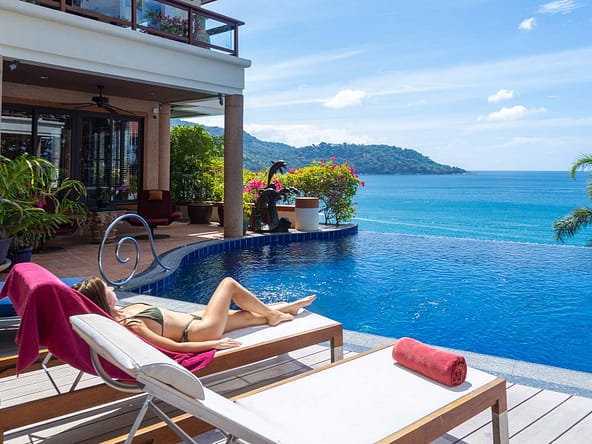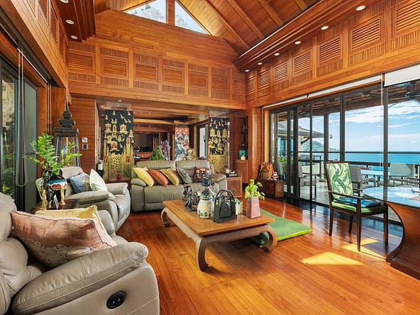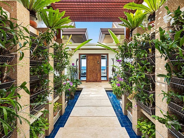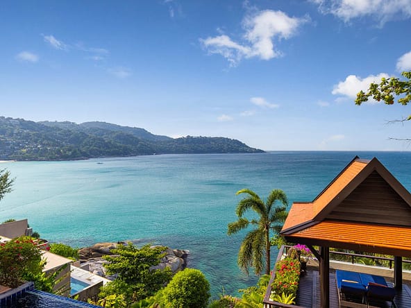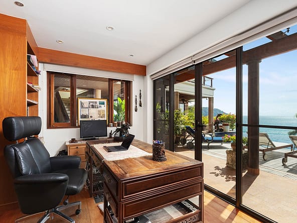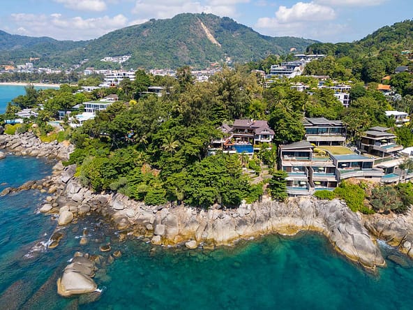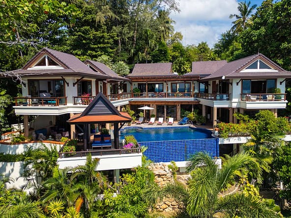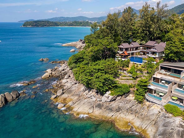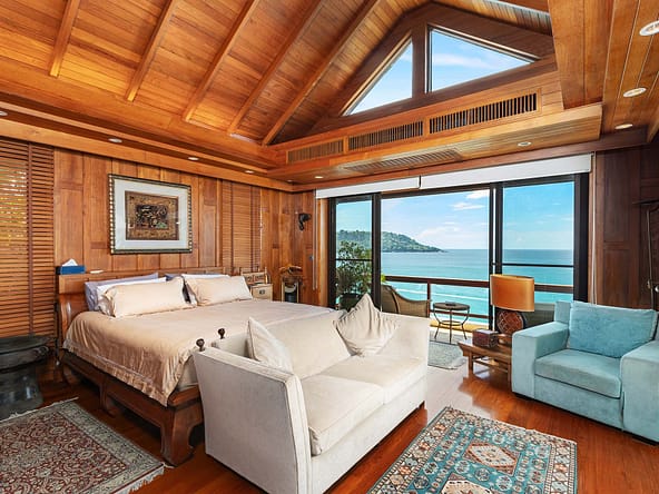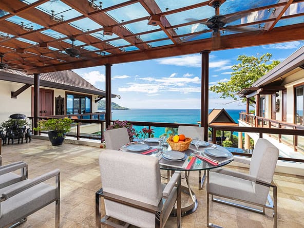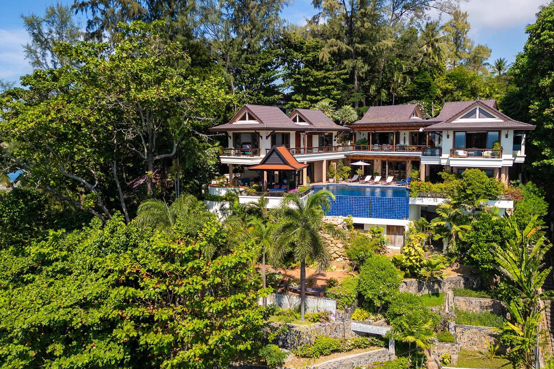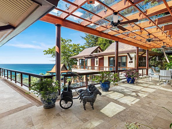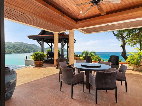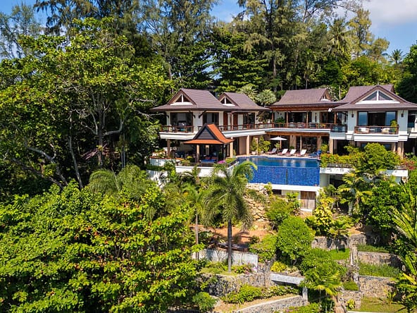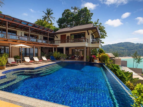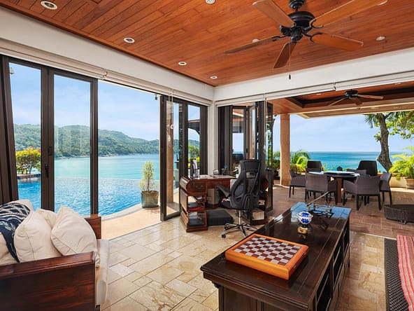 This stunning oceanfront villa is nestled within an exclusive private estate, just a short walk from Phukets renowned Kata and Kata Noi beaches. Offering breathtaking 180-degree panoramic sea views, the villa boasts five bedrooms and expansive open-plan living that flows seamlessly into outdoor areas featuring a private infinity-edge pool, spacious decking, a shaded sala, and manicured tropical gardens with direct ocean access.Arriving at Baan Kata Villa B6, guests are greeted by a serene orchid garden and a pond with cascading water, setting the tone for the tranquil luxury within. The villas distinctive U-shaped layout spans two main floors. The upper level includes the master suite and guest bedrooms, separated by the main living and dining areas. Below, the lower level hosts an entertainment room, outdoor dining space, a study/optional bedroom with ensuite, a library, and another lounge beside a natural stone waterfall and pathway to the sea.Interiors reflect elegant Thai craftsmanship, with teak-paneled walls, custom artwork, and quality furnishings. The dining area features a 10-seat marble-top table, while the living room showcases velvet sofas, built-in bookshelves, and artistic wooden panels by a renowned Thai artist. Large glass doors frame lush garden views throughout.A sea-facing study with ensuite opens to an alfresco sala and lounge overlooking tiered gardens and a granite waterfall. This secure, private villa enjoys a prime location near world-class dining, boutiques, and vibrant village lifeall within easy walking distance.