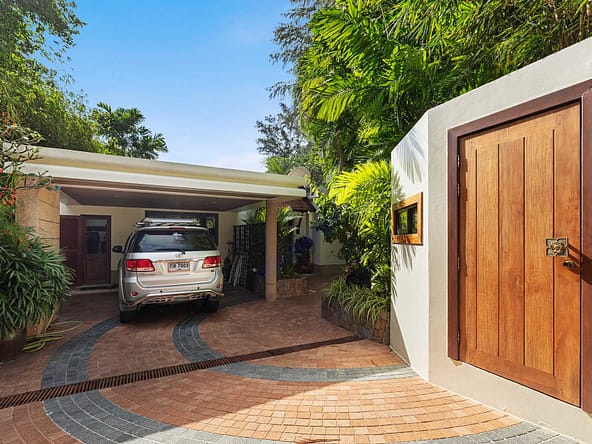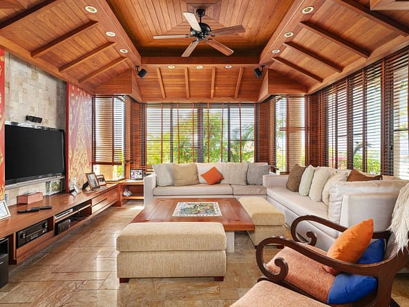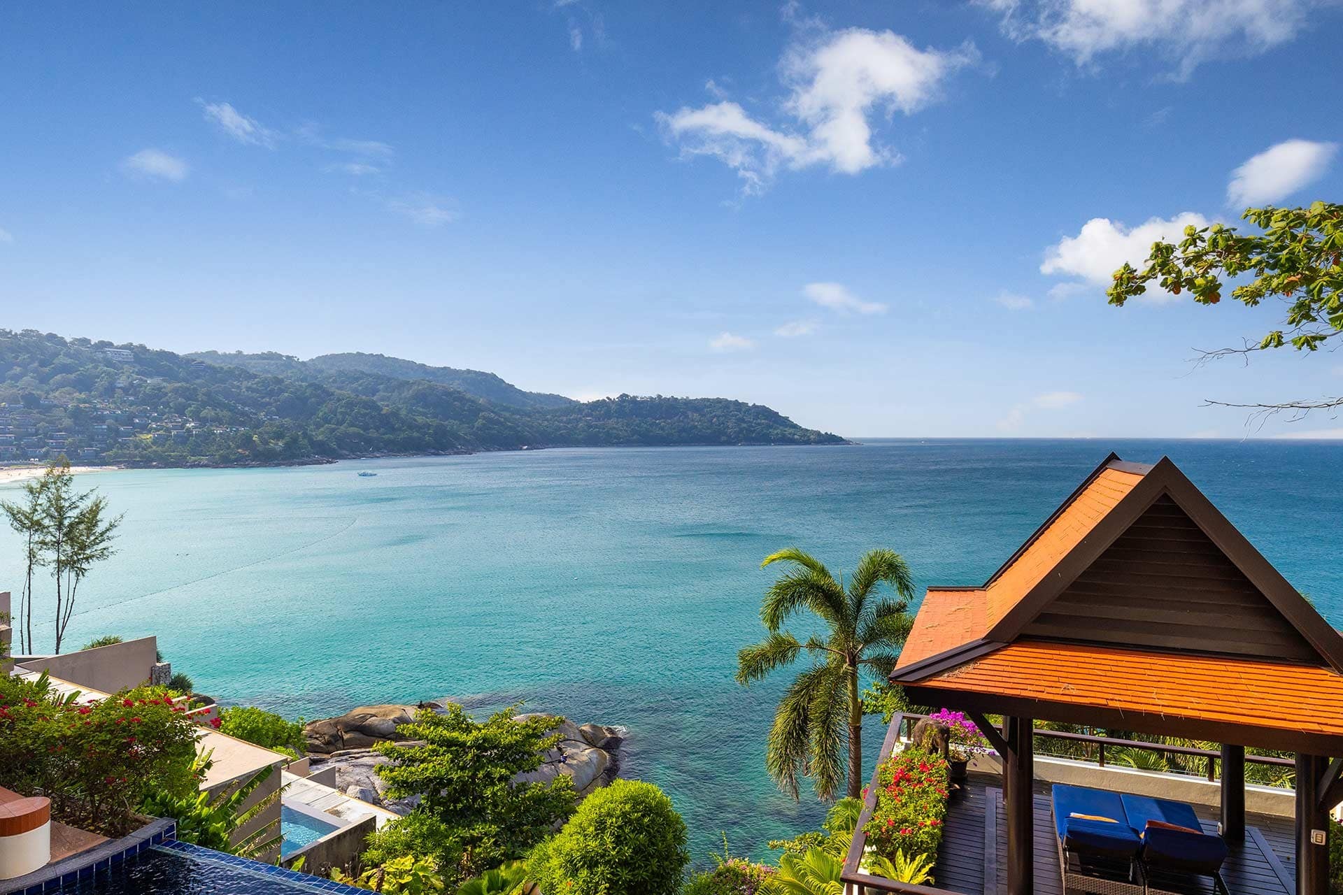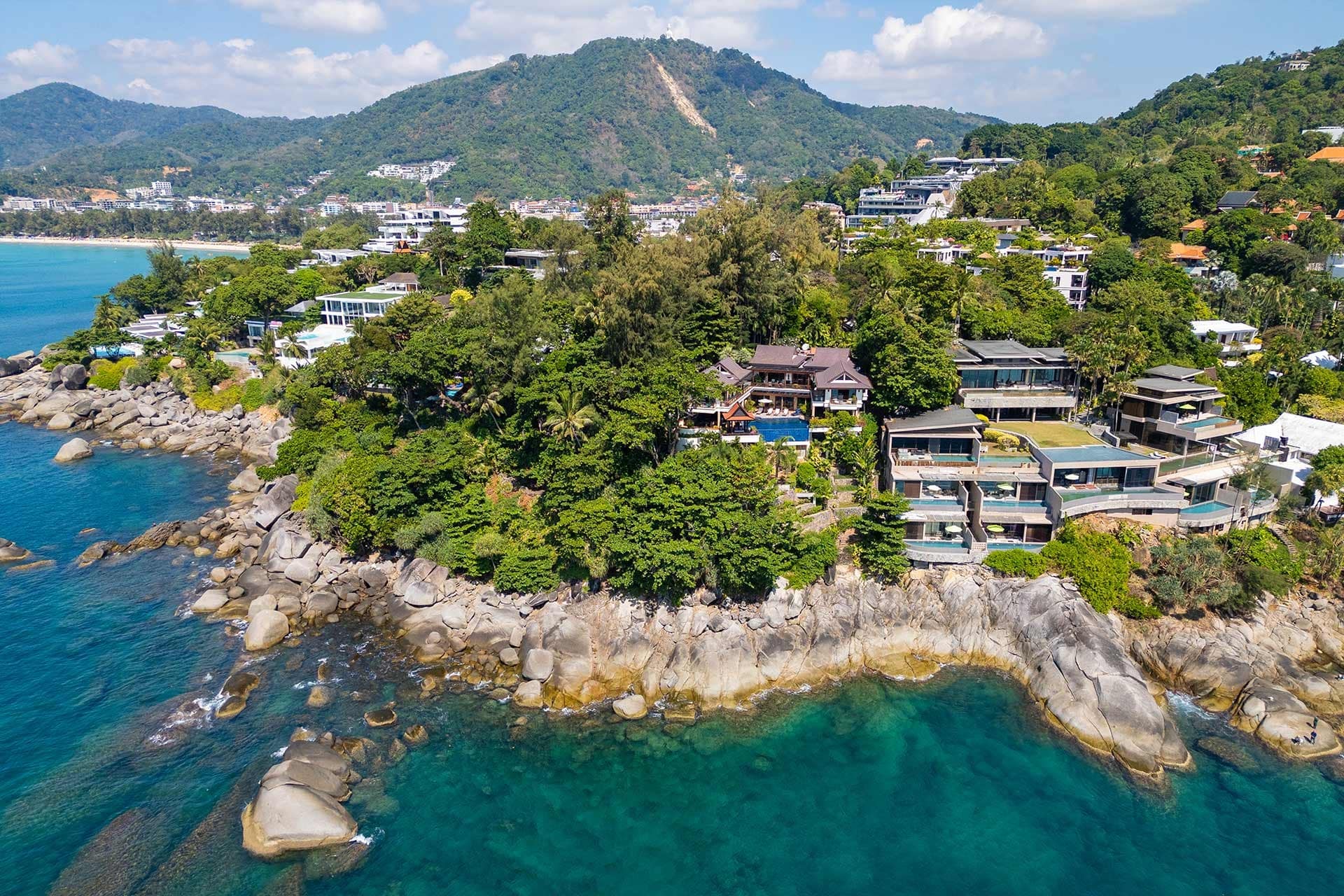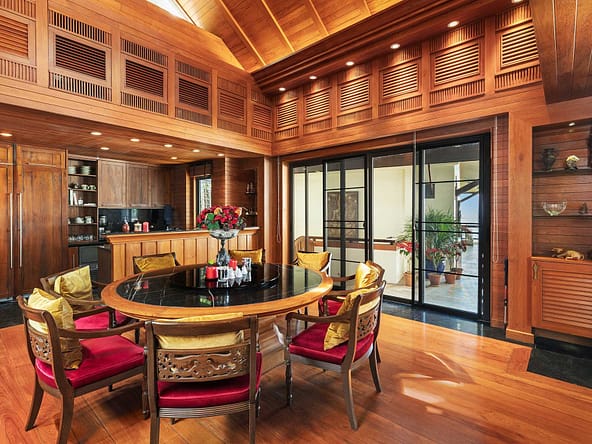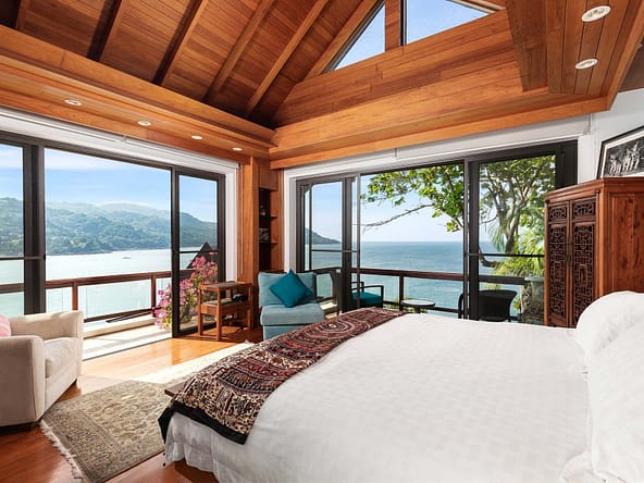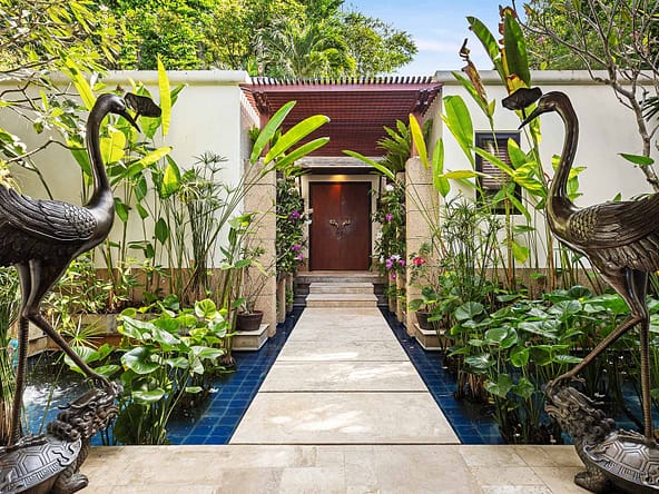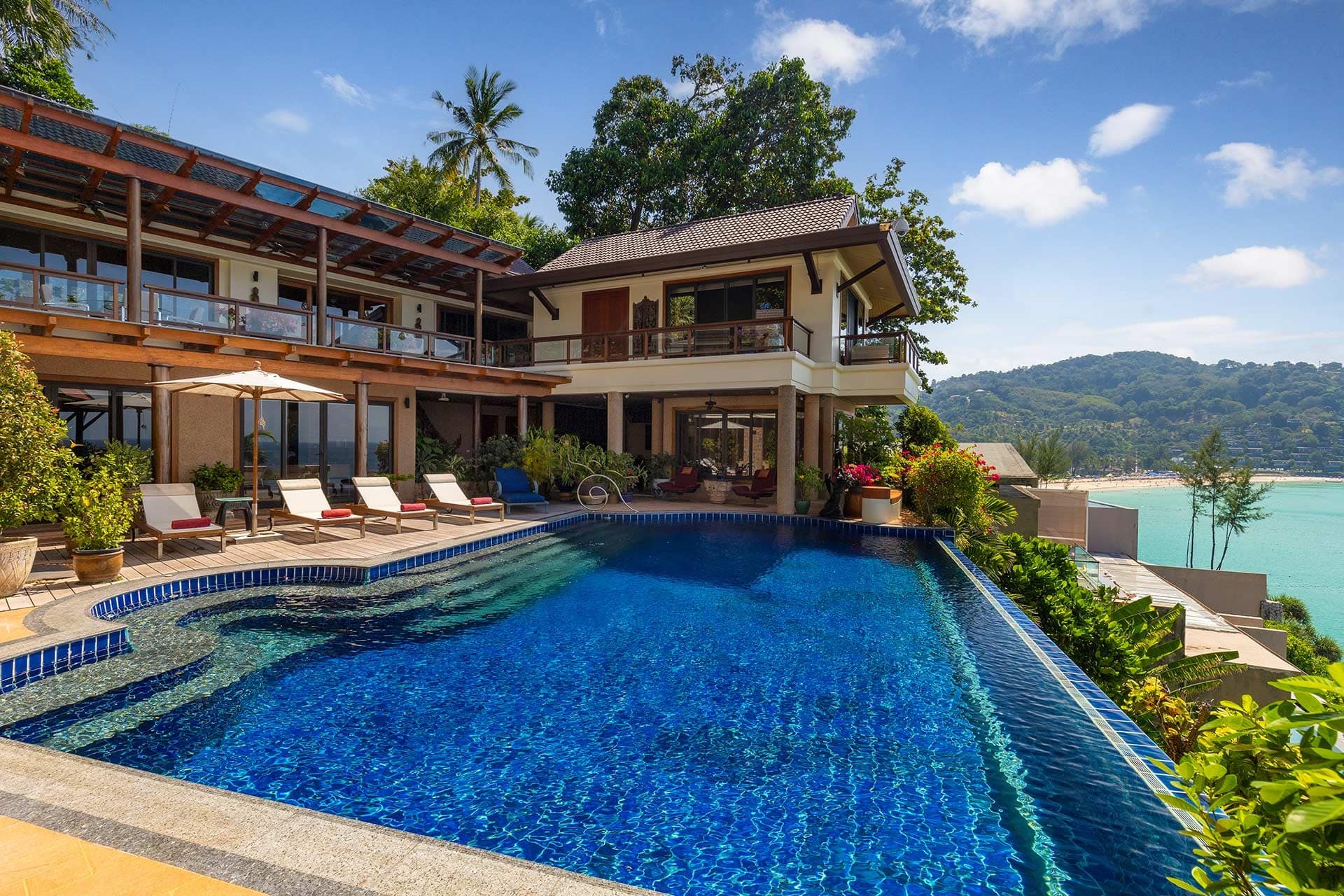 This stunning oceanfront villa is nestled within an exclusive private estate, just a short walk from Phukets renowned Kata and Kata Noi beaches. Offering breathtaking 180-degree panoramic sea views, the villa boasts five bedrooms and expansive open-plan living that flows seamlessly into outdoor areas featuring a private infinity-edge pool, spacious decking, a shaded sala, and manicured tropical gardens with direct ocean access.Arriving at Baan Kata Villa B6, guests are greeted by a serene orchid garden and a pond with cascading water, setting the tone for the tranquil luxury within. The villas distinctive U-shaped layout spans two main floors. The upper level includes the master suite and guest bedrooms, separated by the main living and dining areas. Below, the lower level hosts an entertainment room, outdoor dining space, a study/optional bedroom with ensuite, a library, and another lounge beside a natural stone waterfall and pathway to the sea.Interiors reflect elegant Thai craftsmanship, with teak-paneled walls, custom artwork, and quality furnishings. The dining area features a 10-seat marble-top table, while the living room showcases velvet sofas, built-in bookshelves, and artistic wooden panels by a renowned Thai artist. Large glass doors frame lush garden views throughout.A sea-facing study with ensuite opens to an alfresco sala and lounge overlooking tiered gardens and a granite waterfall. This secure, private villa enjoys a prime location near world-class dining, boutiques, and vibrant village lifeall within easy walking distance.