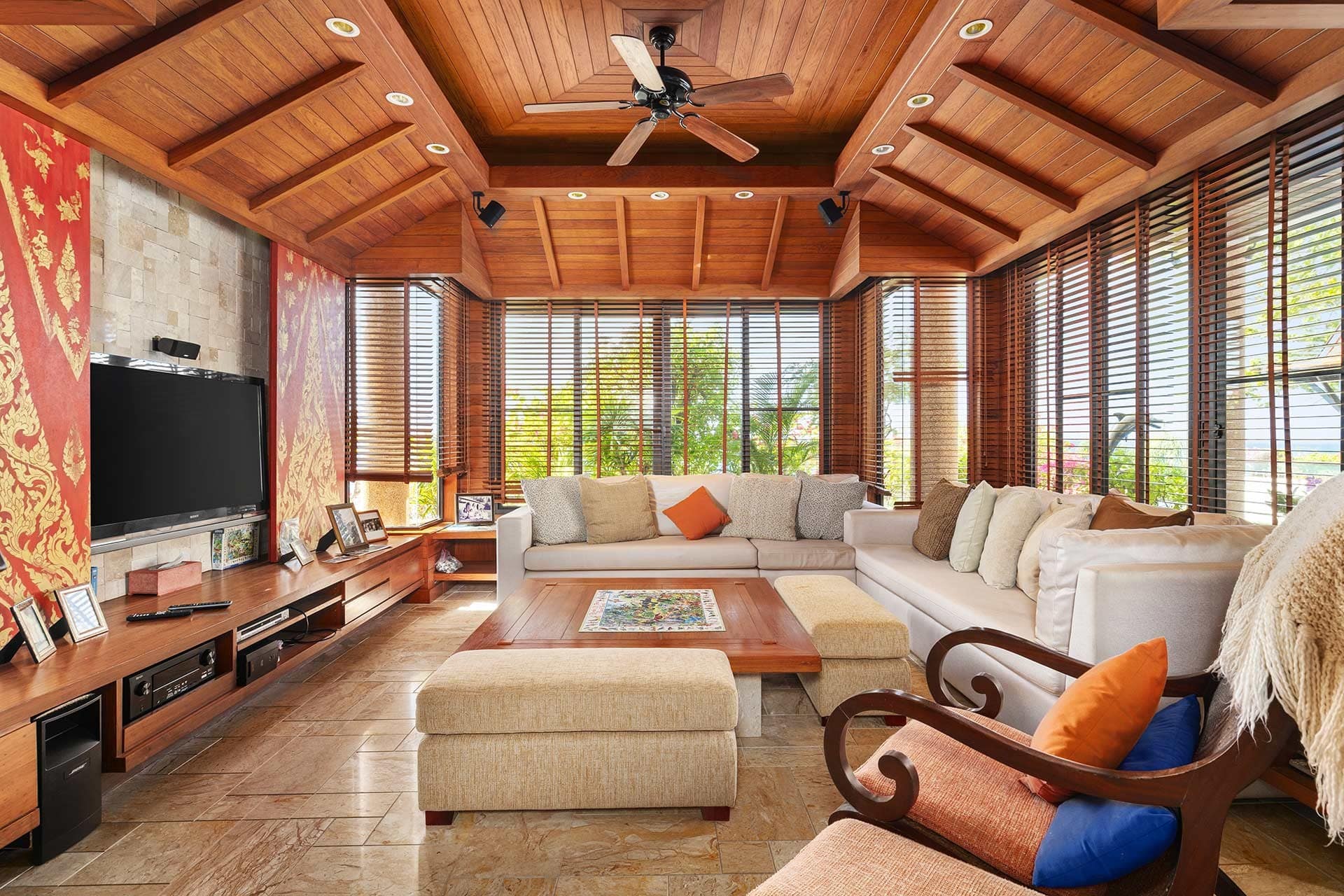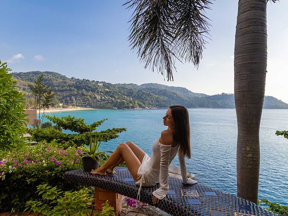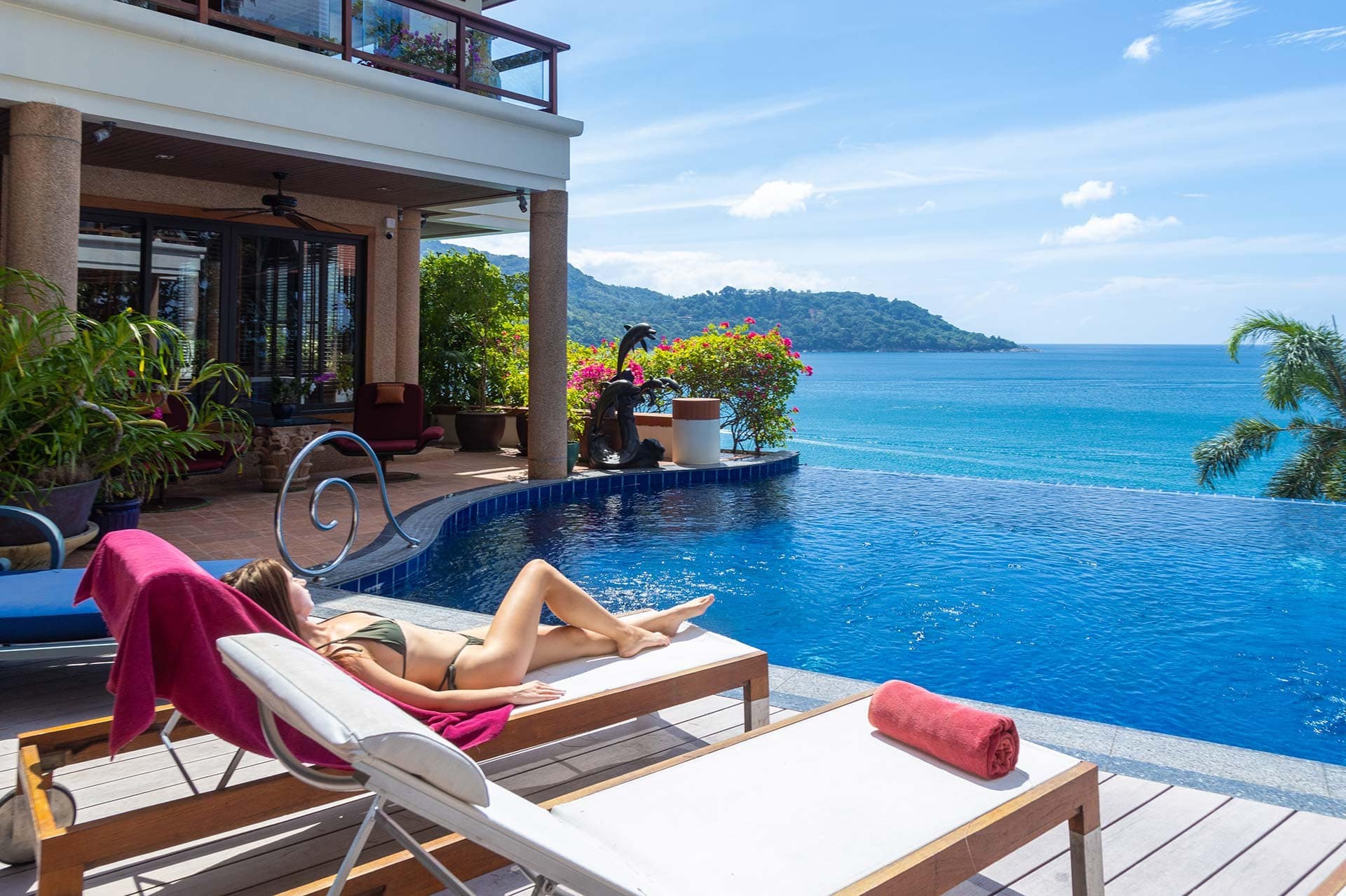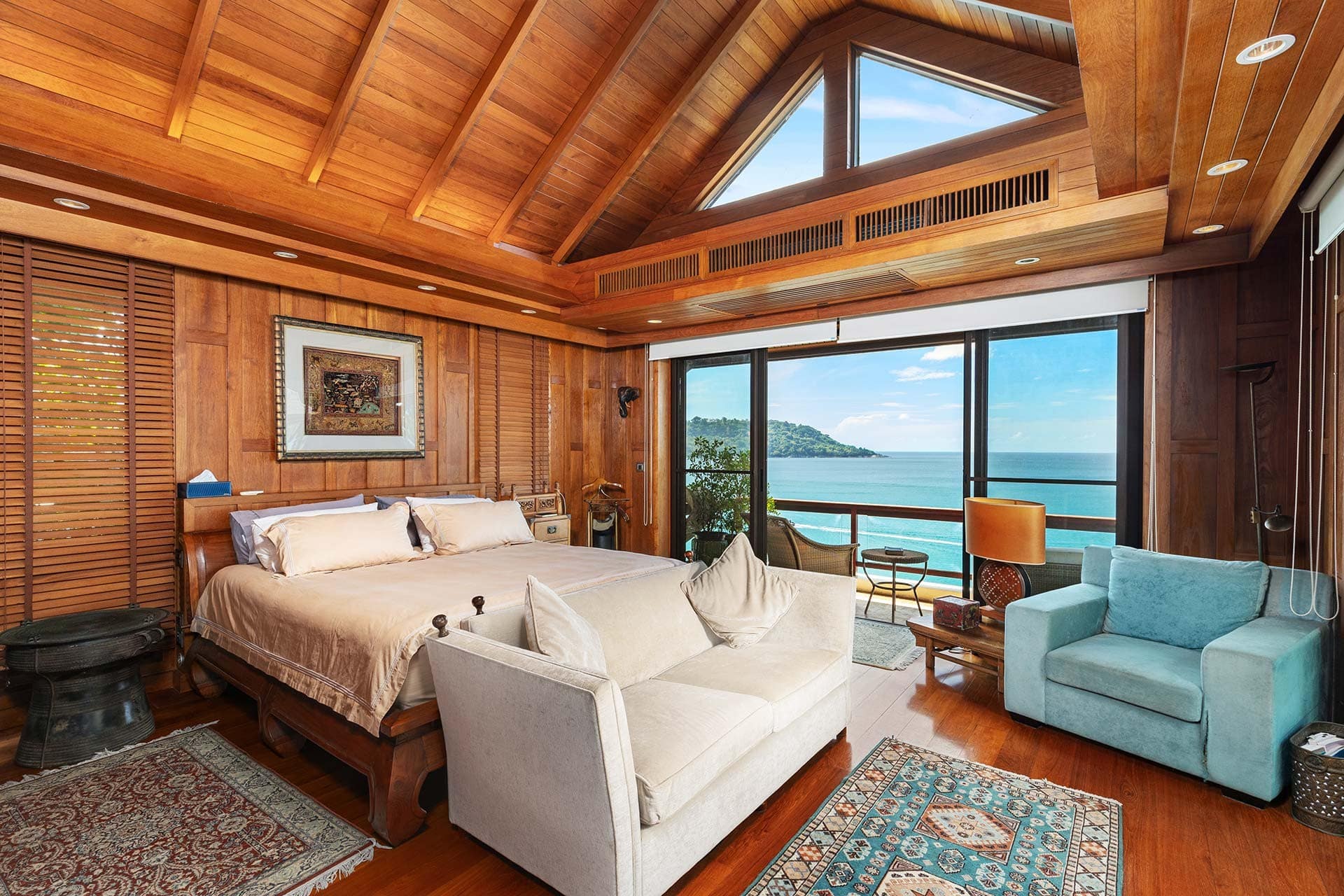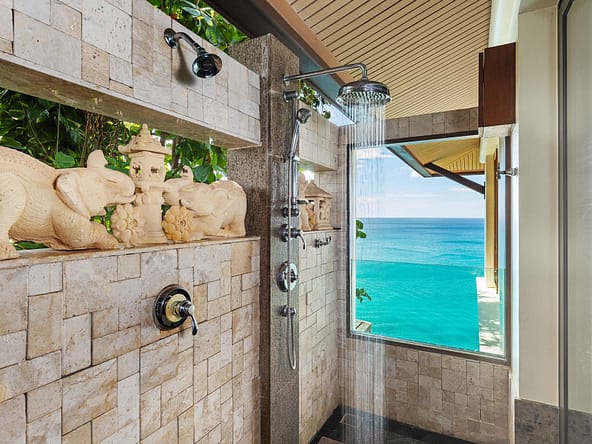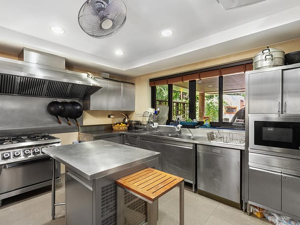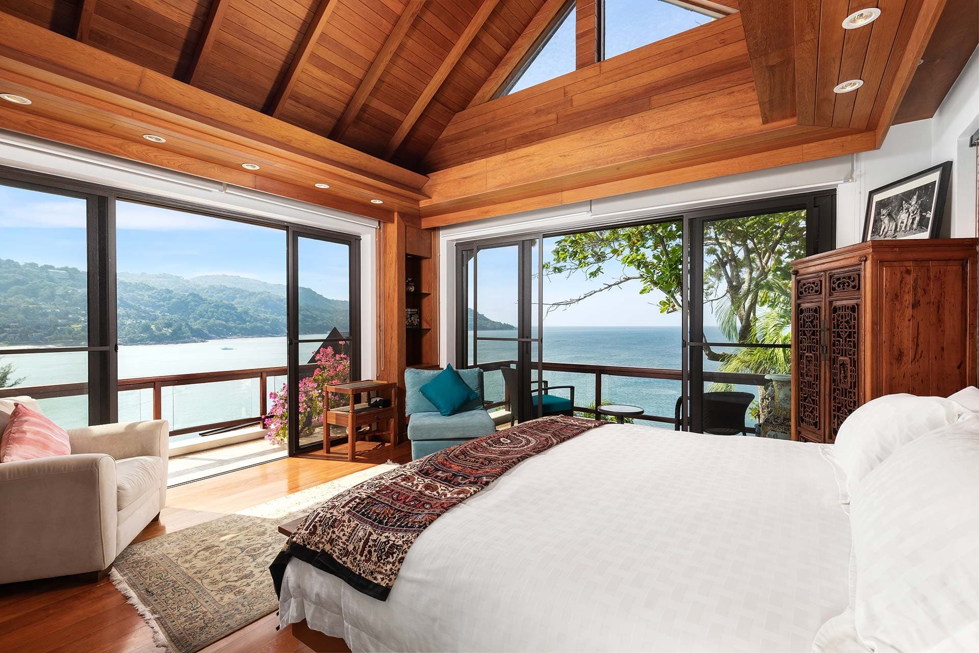 This stunning oceanfront villa is nestled within an exclusive private estate, just a short walk from Phukets renowned Kata and Kata Noi beaches. Offering breathtaking 180-degree panoramic sea views, the villa boasts five bedrooms and expansive open-plan living that flows seamlessly into outdoor areas featuring a private infinity-edge pool, spacious decking, a shaded sala, and manicured tropical gardens with direct ocean access.Arriving at Baan Kata Villa B6, guests are greeted by a serene orchid garden and a pond with cascading water, setting the tone for the tranquil luxury within. The villas distinctive U-shaped layout spans two main floors. The upper level includes the master suite and guest bedrooms, separated by the main living and dining areas. Below, the lower level hosts an entertainment room, outdoor dining space, a study/optional bedroom with ensuite, a library, and another lounge beside a natural stone waterfall and pathway to the sea.Interiors reflect elegant Thai craftsmanship, with teak-paneled walls, custom artwork, and quality furnishings. The dining area features a 10-seat marble-top table, while the living room showcases velvet sofas, built-in bookshelves, and artistic wooden panels by a renowned Thai artist. Large glass doors frame lush garden views throughout.A sea-facing study with ensuite opens to an alfresco sala and lounge overlooking tiered gardens and a granite waterfall. This secure, private villa enjoys a prime location near world-class dining, boutiques, and vibrant village lifeall within easy walking distance.