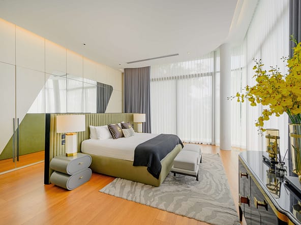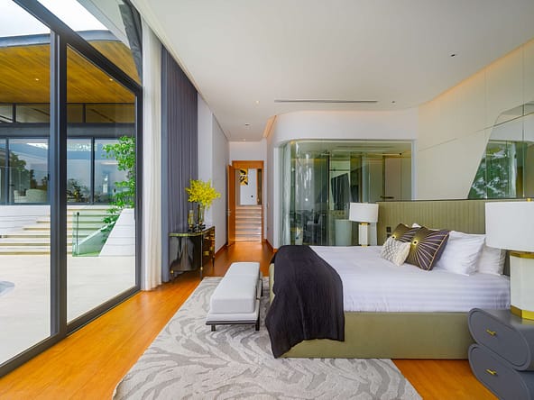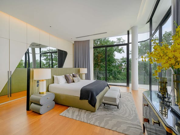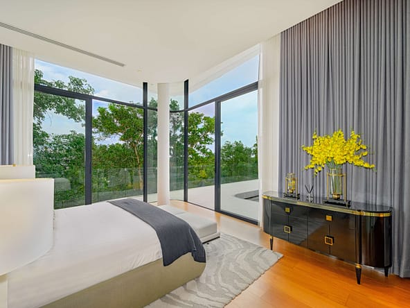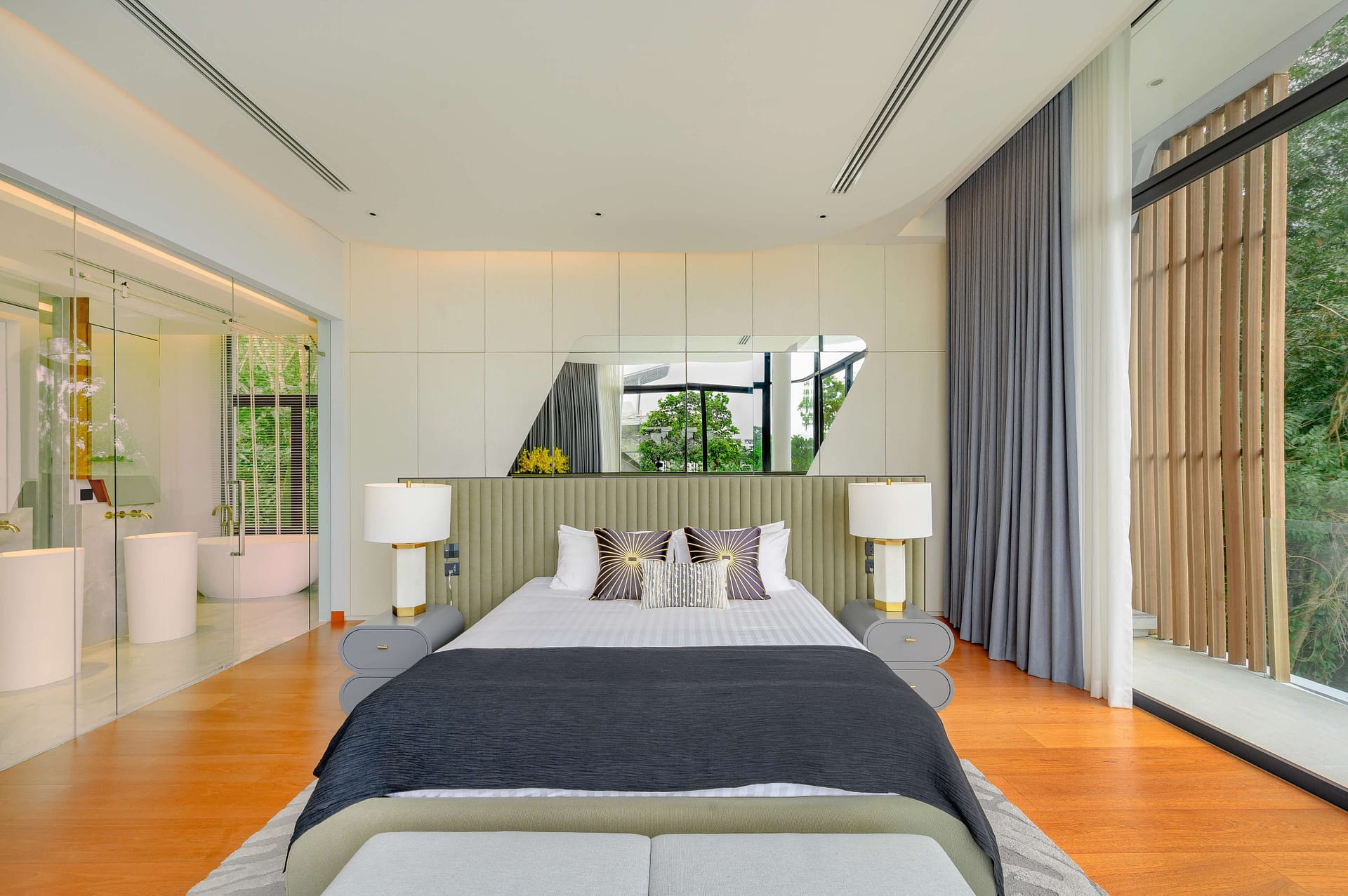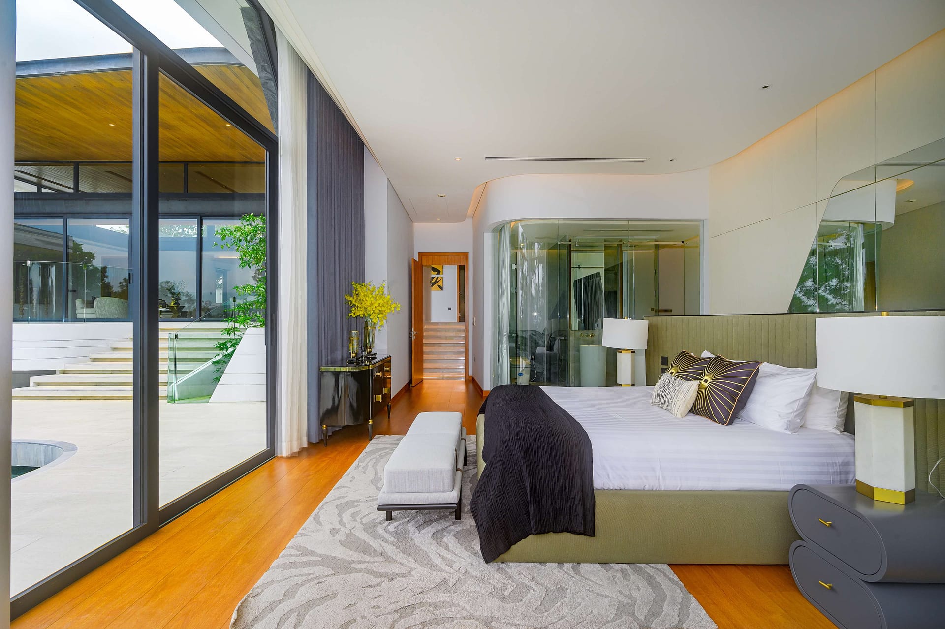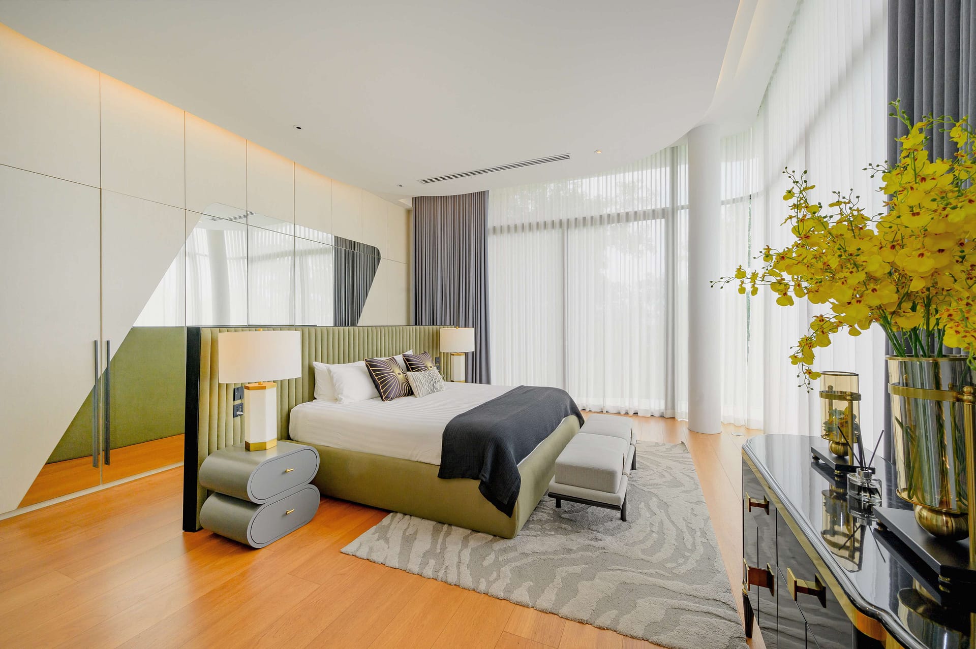 Each of the 4 to 5 bedrooms has been thoughtfully crafted, situated in various parts of the villa to offer distinct layouts and ambiances. The master bedroom, a standout feature, is nestled close to awe-inspiring natural views, boasting a sleek, curvaceous design and sophisticated furniture. Step directly from this bedroom to enjoy exclusive access to the swimming pool, a tranquil retreat.