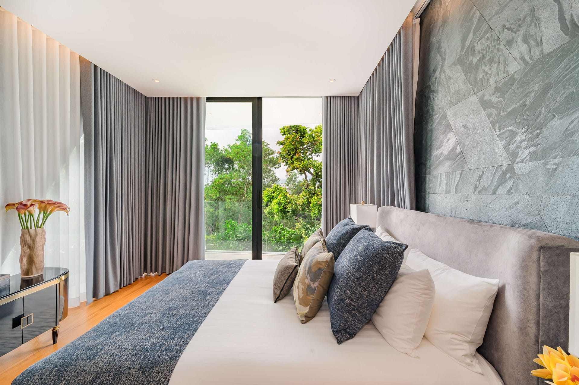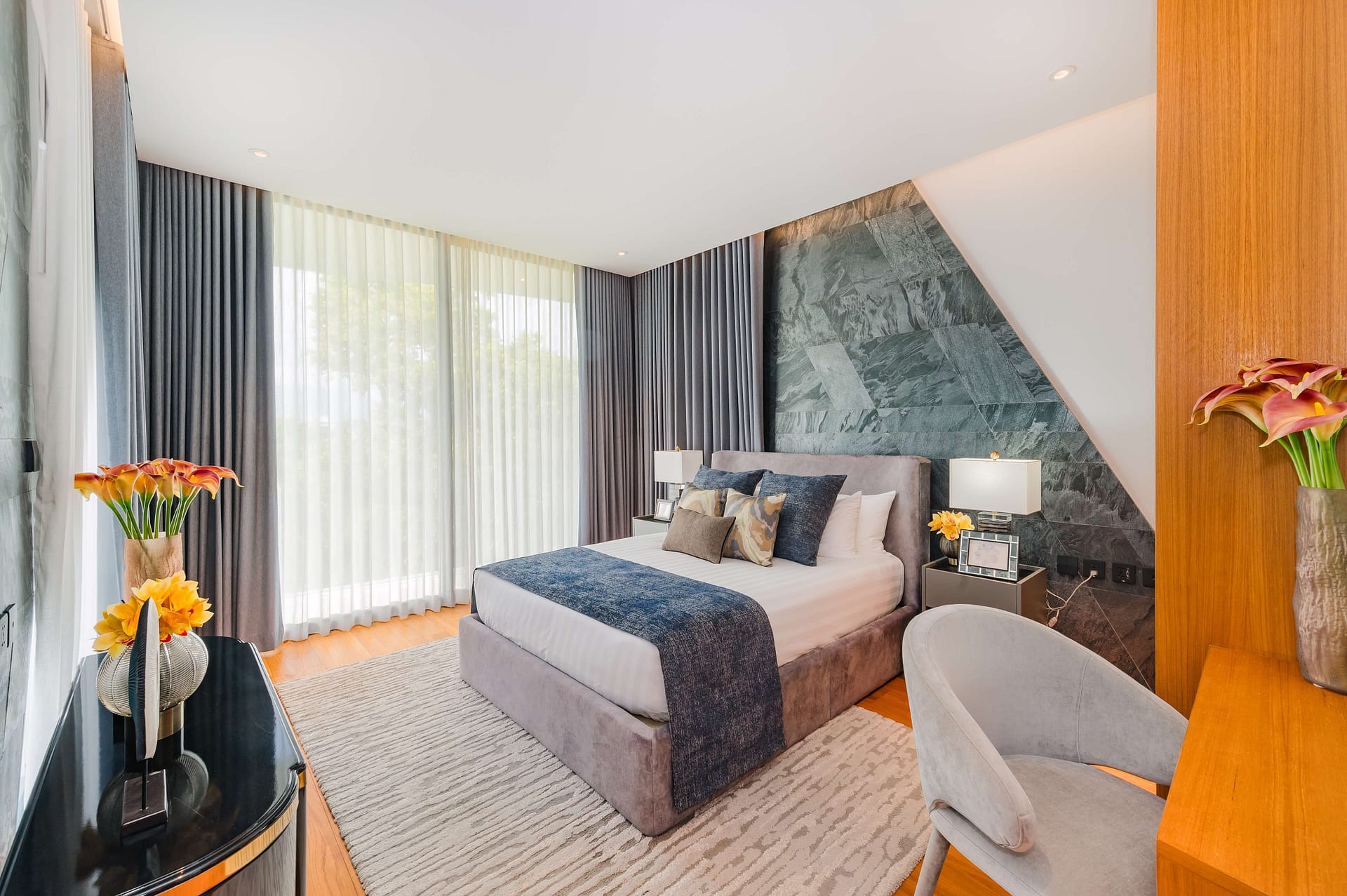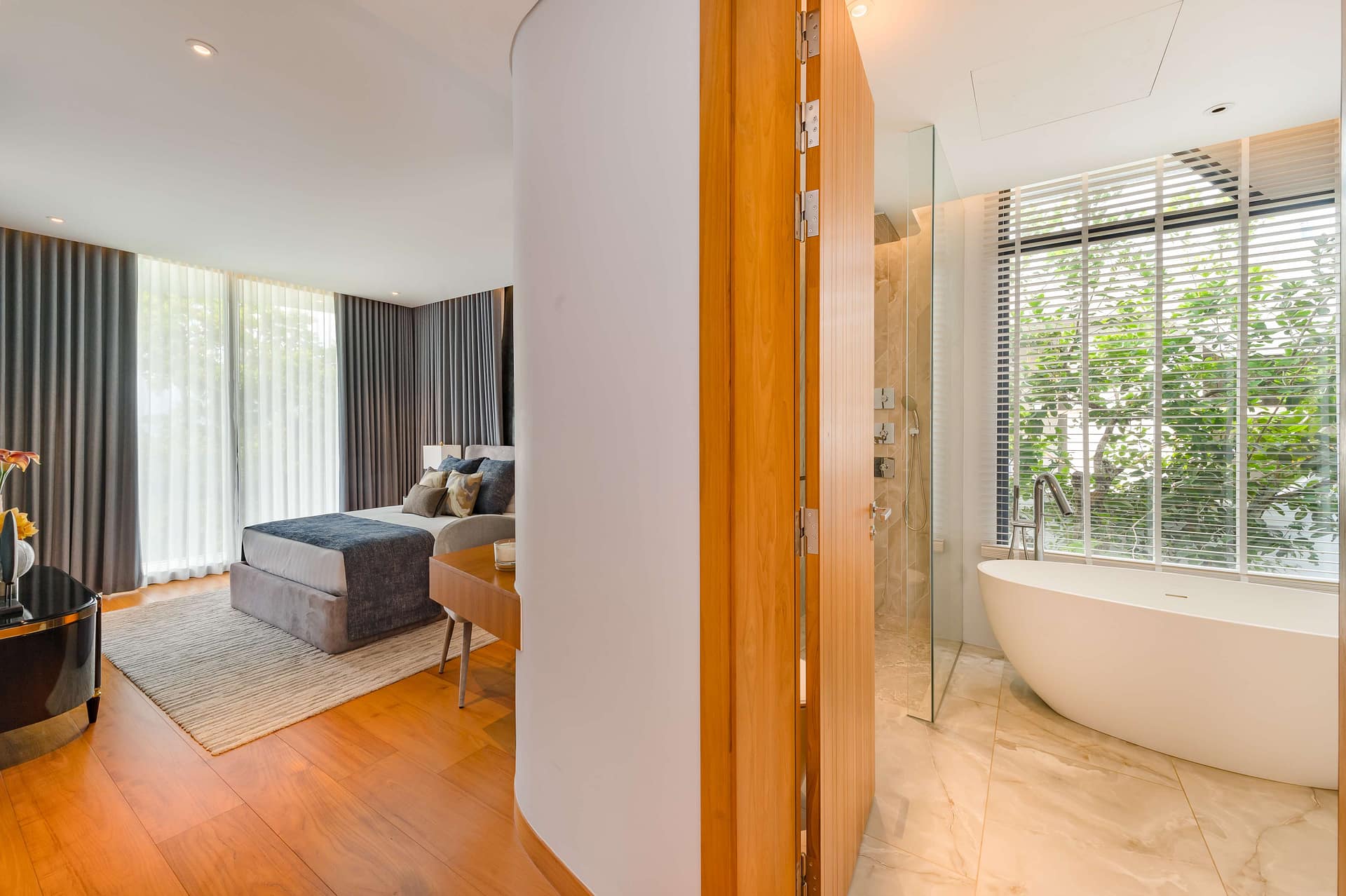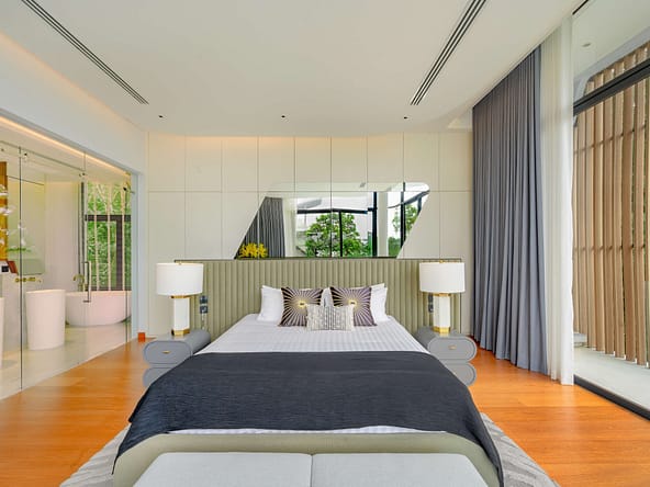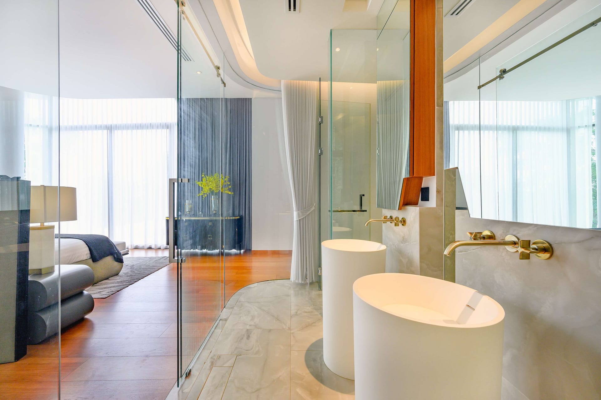 Each of the 4 to 5 bedrooms has been thoughtfully crafted, situated in various parts of the villa to offer distinct layouts and ambiances. The master bedroom, a standout feature, is nestled close to awe-inspiring natural views, boasting a sleek, curvaceous design and sophisticated furniture. Step directly from this bedroom to enjoy exclusive access to the swimming pool, a tranquil retreat.