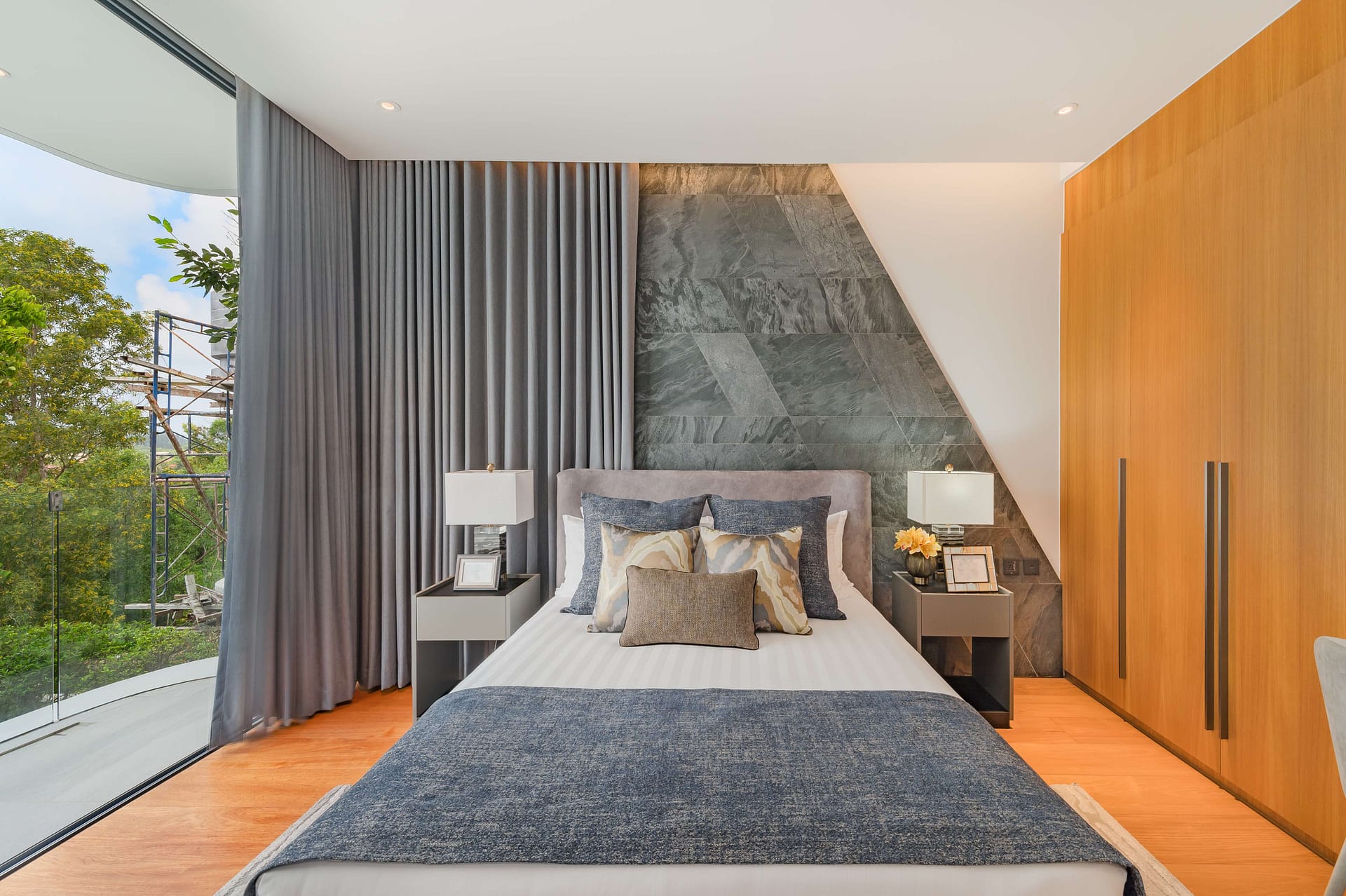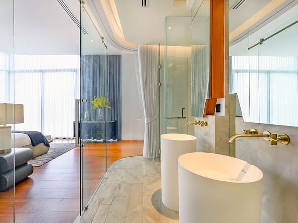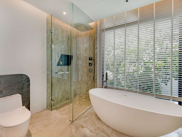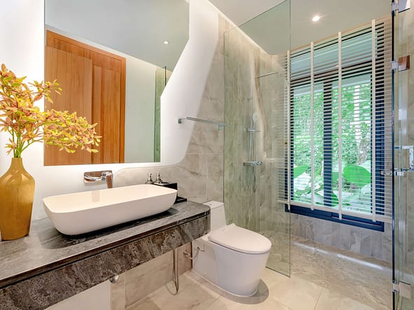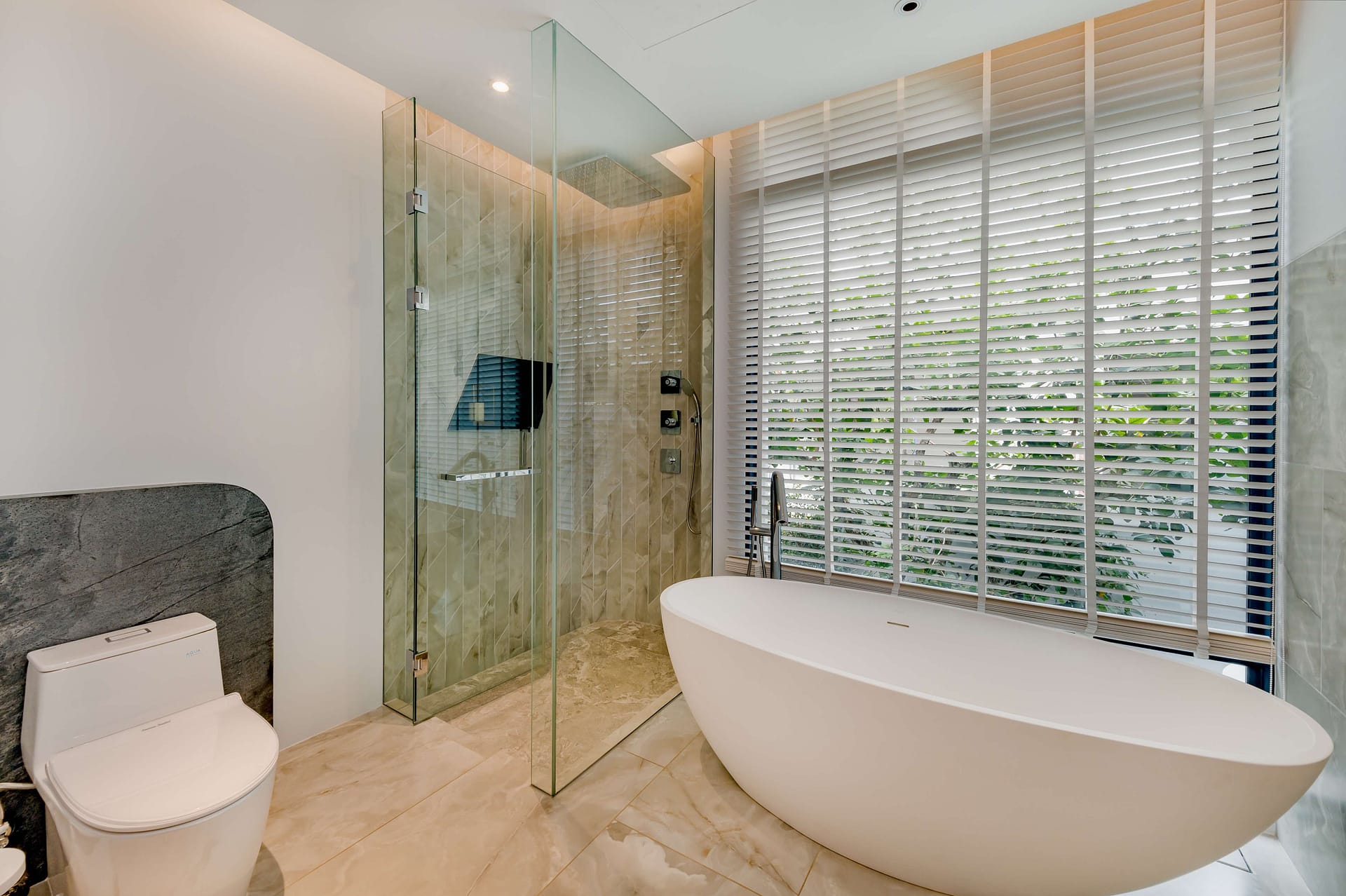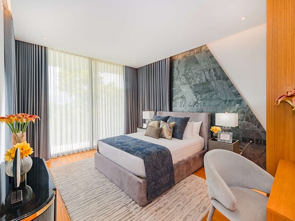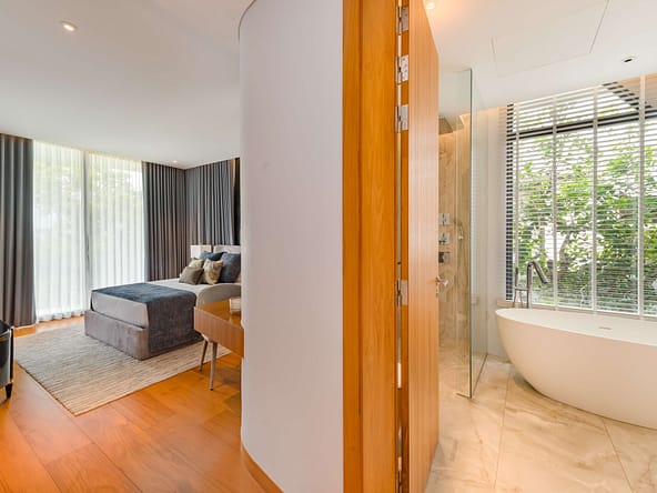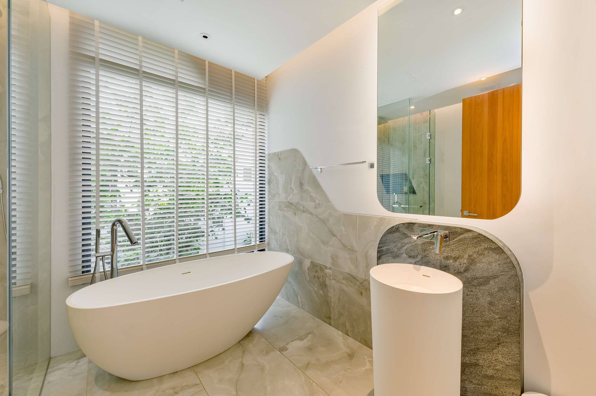 Each of the 4 to 5 bedrooms has been thoughtfully crafted, situated in various parts of the villa to offer distinct layouts and ambiances. The master bedroom, a standout feature, is nestled close to awe-inspiring natural views, boasting a sleek, curvaceous design and sophisticated furniture. Step directly from this bedroom to enjoy exclusive access to the swimming pool, a tranquil retreat.