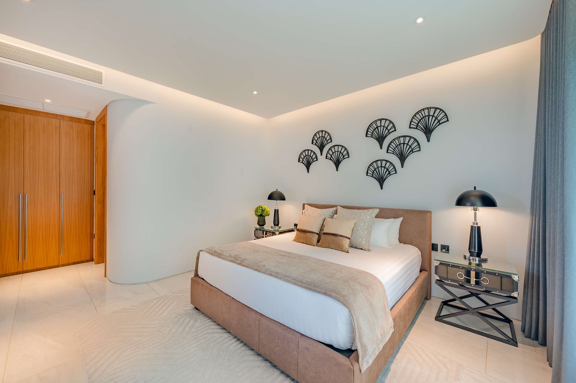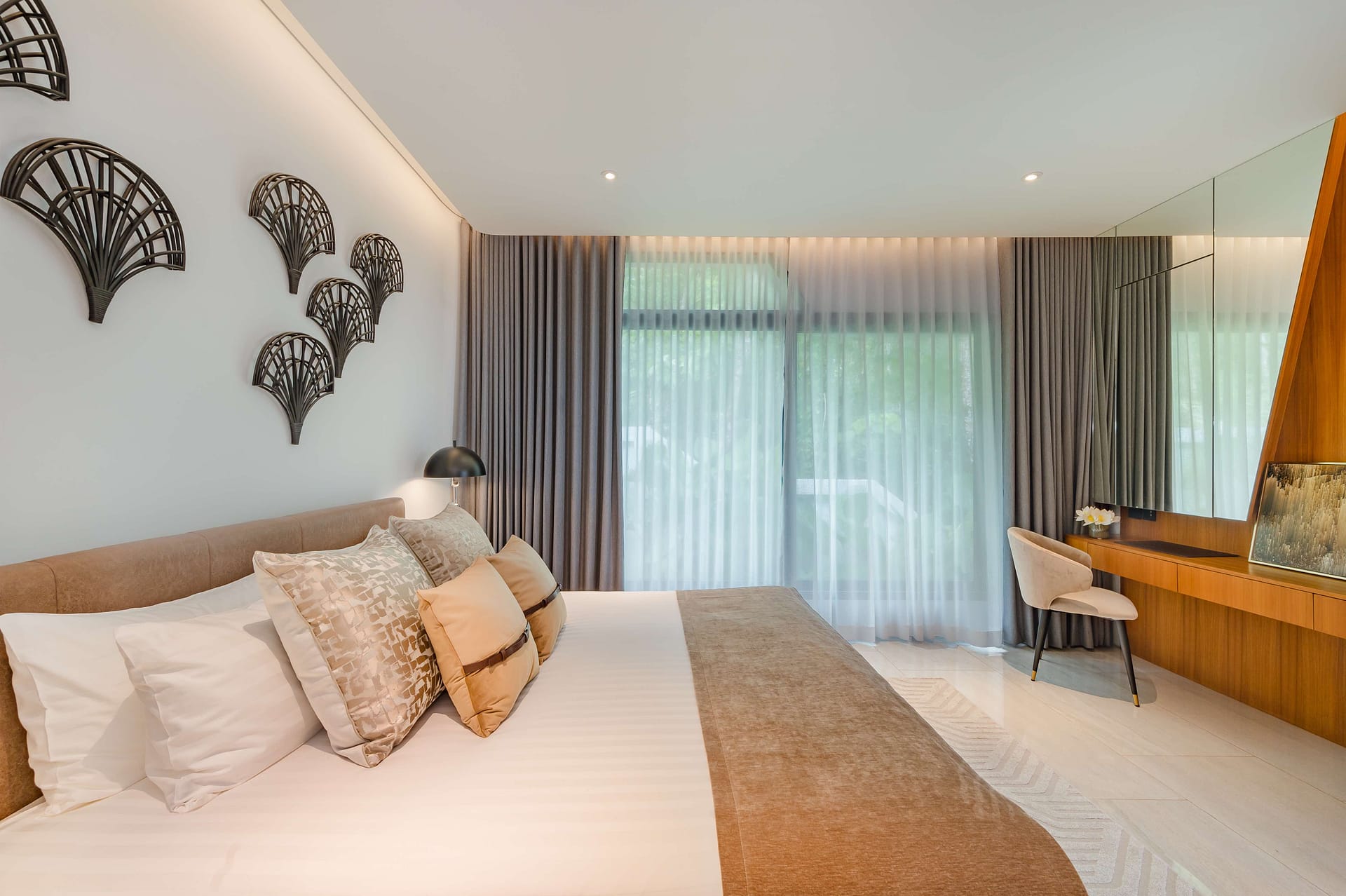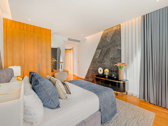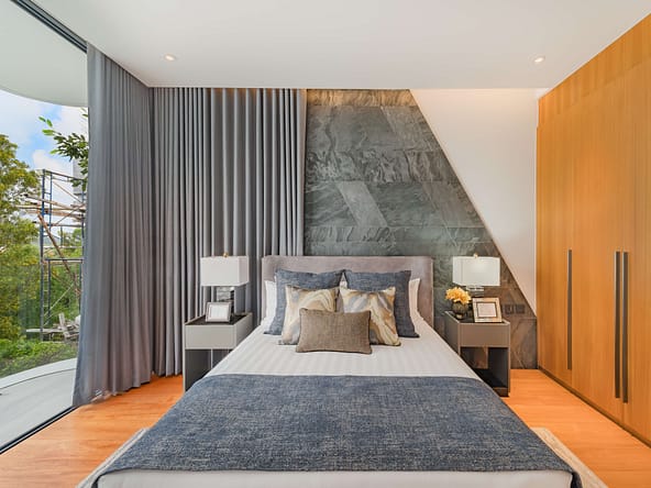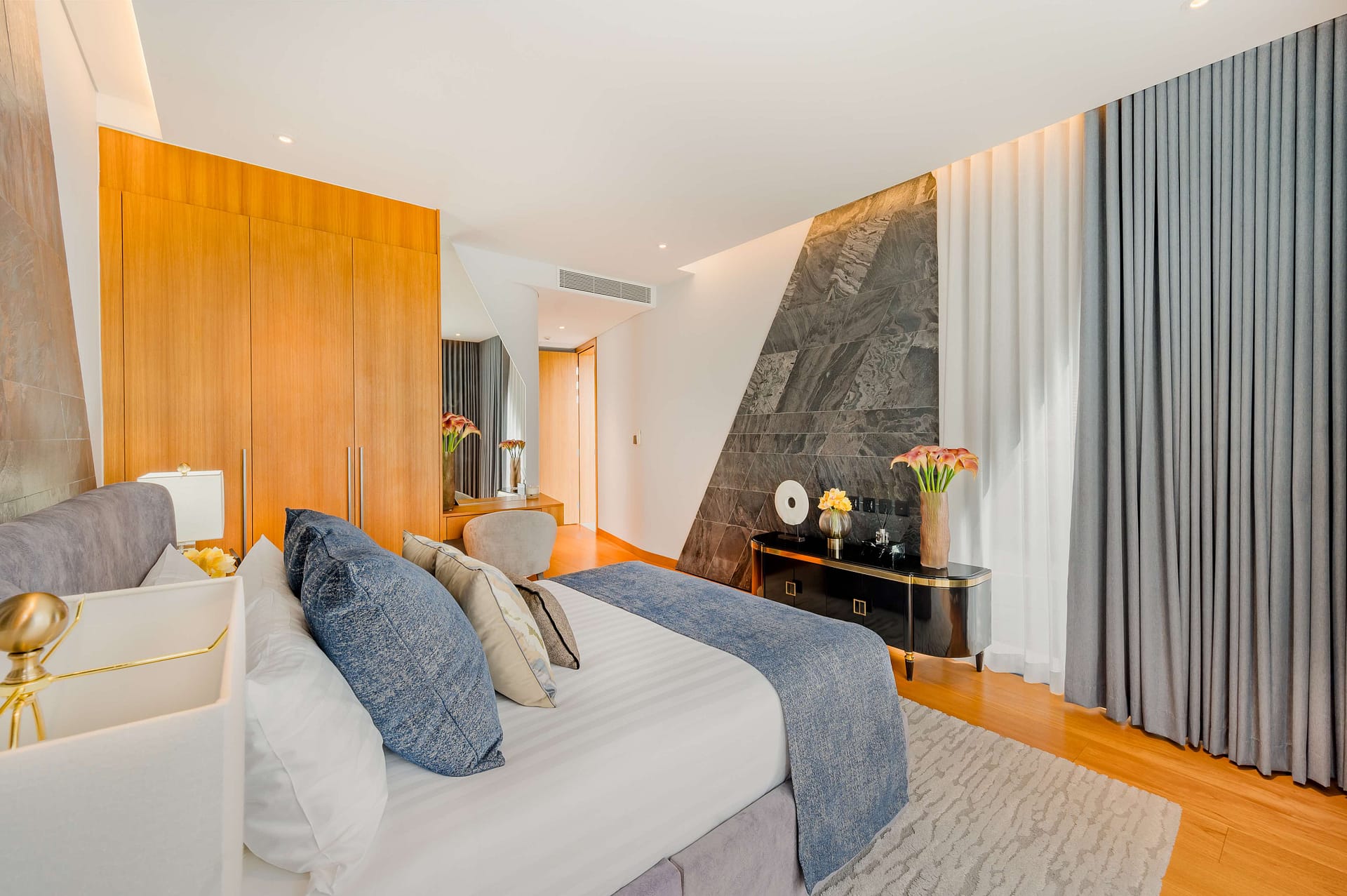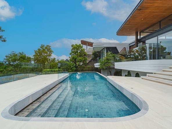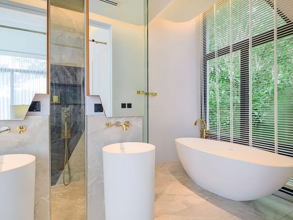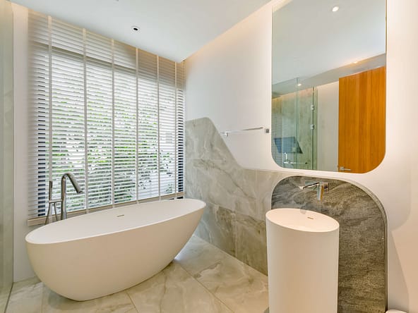 Each of the 4 to 5 bedrooms has been thoughtfully crafted, situated in various parts of the villa to offer distinct layouts and ambiances. The master bedroom, a standout feature, is nestled close to awe-inspiring natural views, boasting a sleek, curvaceous design and sophisticated furniture. Step directly from this bedroom to enjoy exclusive access to the swimming pool, a tranquil retreat.