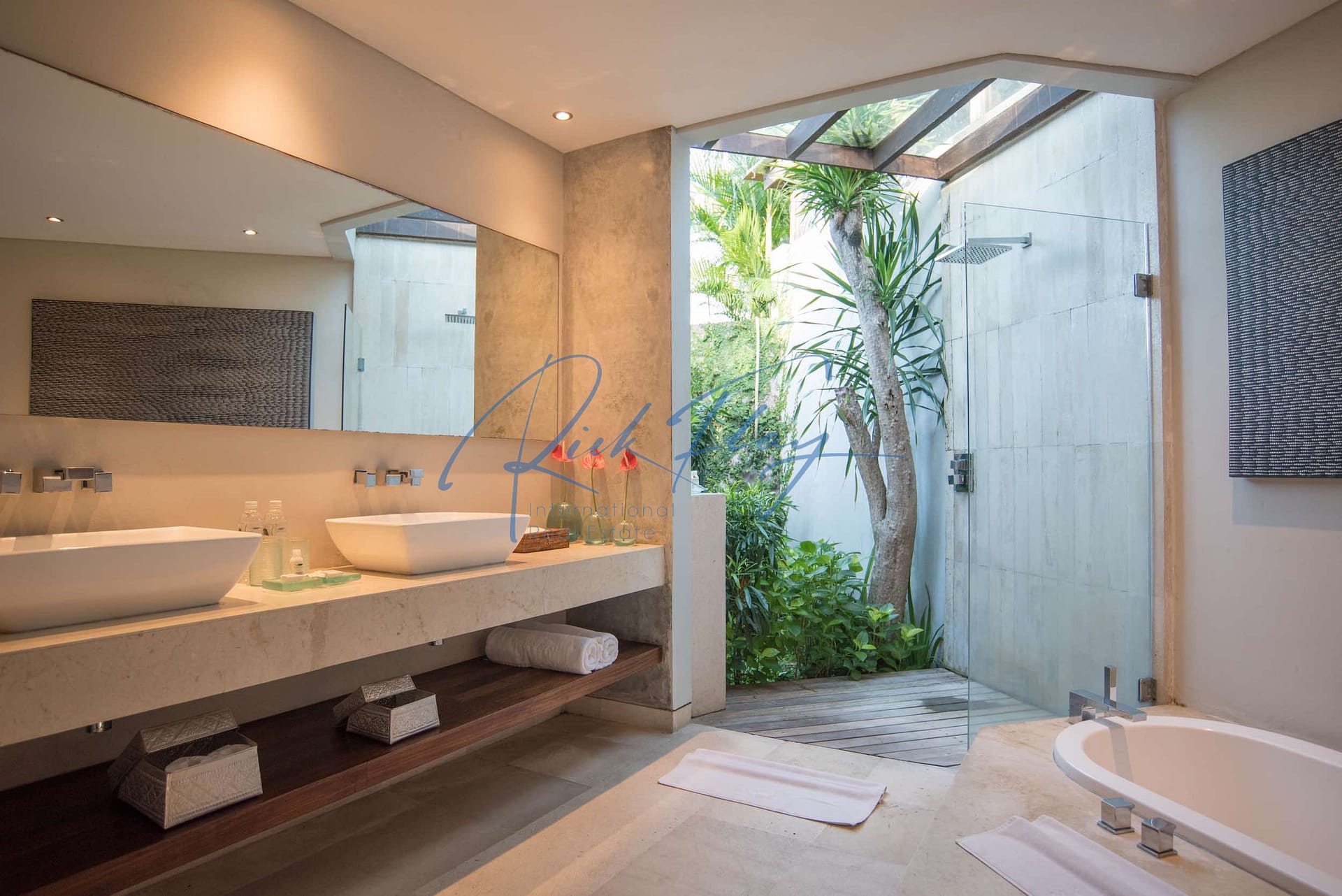 There are three king sized, air-conditioned designer bedrooms with stone and teak wood floors, built in wardrobes and spacious ensuite bathrooms with air conditioning, double sinks, hot tubs and rain showers.