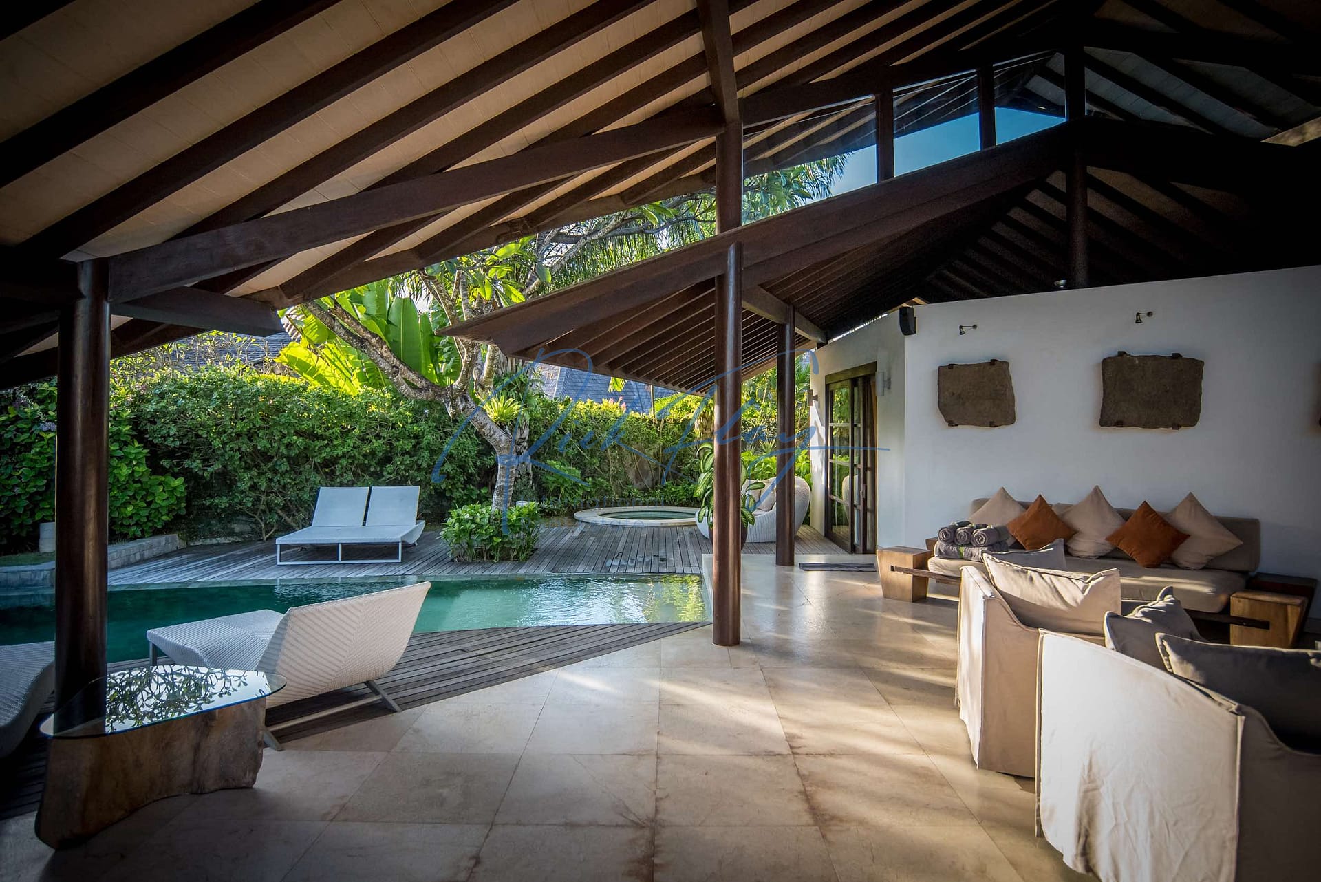 The villa has a private walled garden and a swimming pool with timber decking, a sunken ‘bale’ relaxation pavilion with a huge daybed, and grassed sunbathing areas. There is also an under-croft garage for a car and bikes.