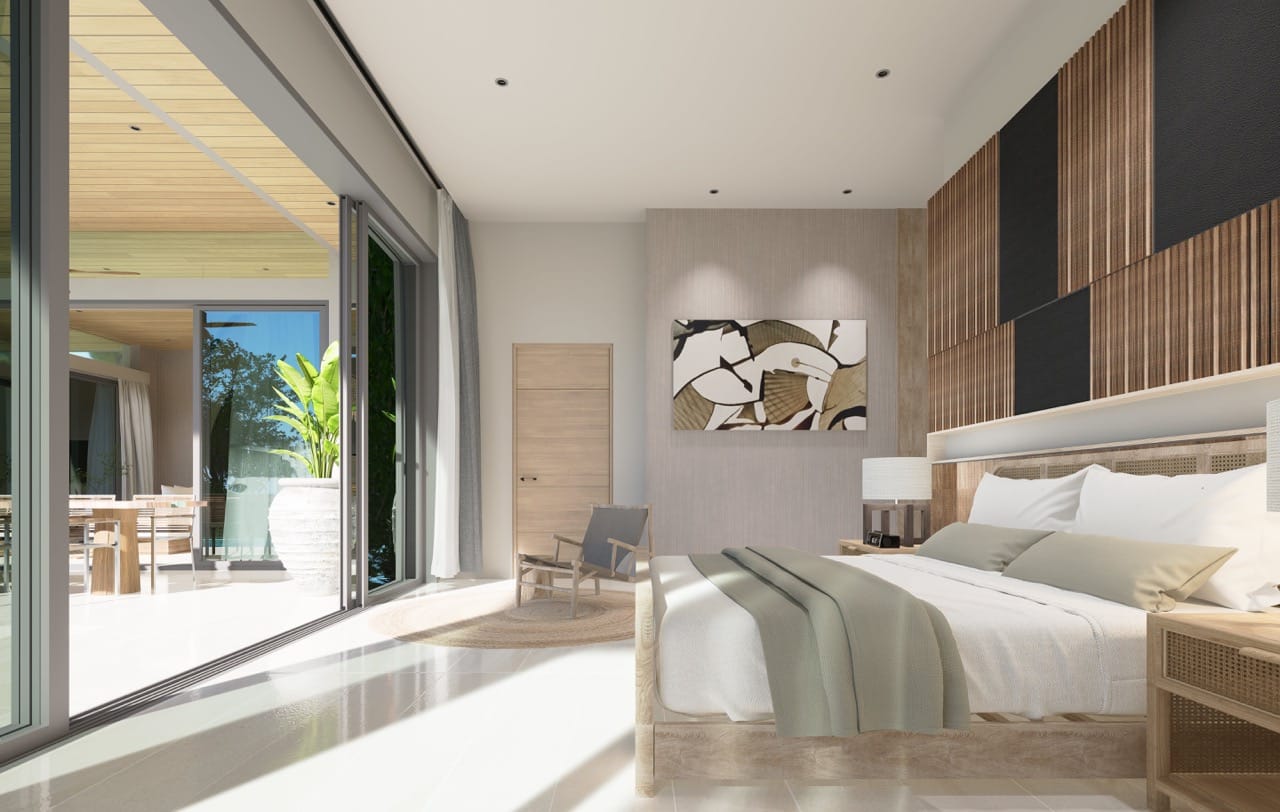 Single-storey luxury beachfront villas feature 4 luxury bedrooms including a master bedroom with its own beach-facing terrace, while an open plan living/dining area leads to an expansive terrace and swimming pool in front of a garden by the beach.
