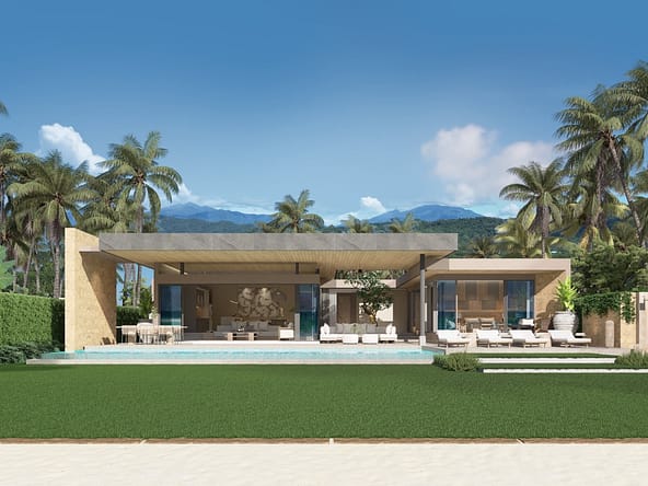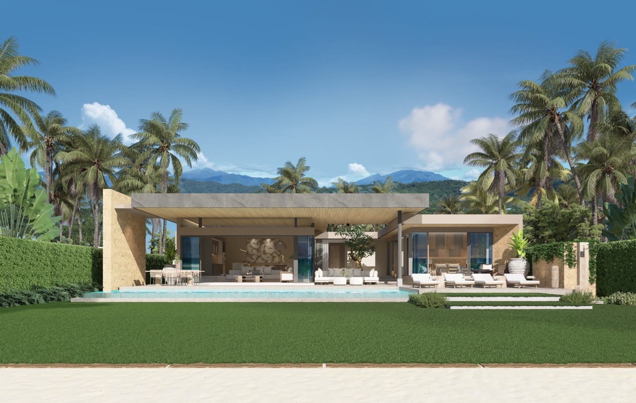 Single-storey luxury beachfront villas feature 4 luxury bedrooms including a master bedroom with its own beach-facing terrace, while an open plan living/dining area leads to an expansive terrace and swimming pool in front of a garden by the beach.