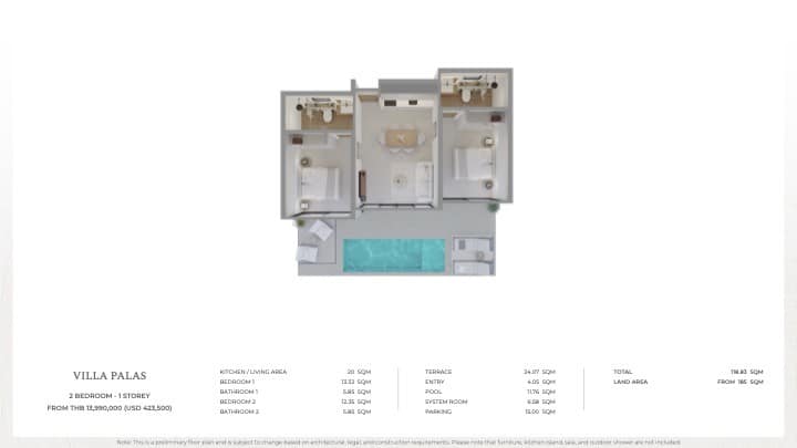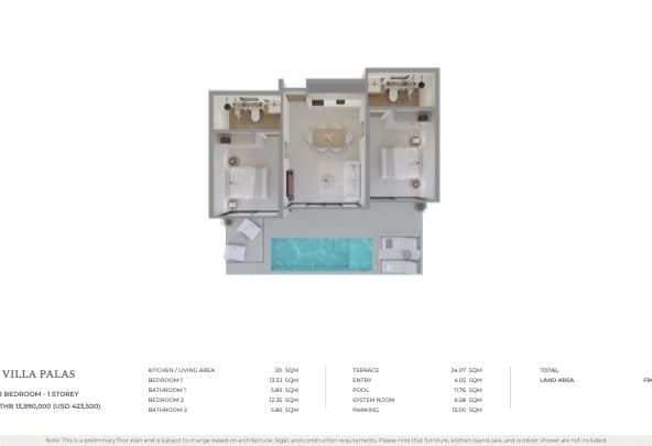 Sunrise Valley offers contemporary luxury villas surrounded by the sun-soaked landscapes of the captivating Phuket island.Fringed by lush foliage, Sunrise Valley is a collection of exclusive private pool villas ranging from 2 to 3 bedrooms.Sunrise Valley benefits from a desirable location, exquisite exterior and interior designs and an impeccablequality assurance – ensuring you an asset of high capitalizable value.2 Bedroom / 1 storey – 118 sqm Prices From: 13,990,000 THB / $423,500 USD3 Bedroom / 1 storey – 175 sqm Prices From: 15,990,000 THB / $484,500 USD3 Bedroom / 2 storey – 269 sqm Prices From: 22,490,000 THB / $674,500 USDFULLY-FITTEDThe villas are delivered fully-fitted with bathrooms, kitchen, sliding windows, doors, floors & plastered white ceiling, lighting, electrical, water system; an air conditioner, and a fan in each bedroom as well as a fan in each shared room.UNFURNISHEDThe villas will come unfurnished, but as a service, we will assist you with the sourcing, selection, acquisition, and installation of everything required to get your villa ready for occupancy.AN OUTSTANDING LOCATIONSunrise Valley is located in the prime area of Cherng Talay, Bang Tao. Only 4.9 km from Bangtao Beach and 6.6 km from Layan Beach, this prime area has many restaurants, golf courses, conveniences, hospitals as well as the famous Catch Beach Club.INVESTMENT SAFETYYou are assured absolute safety when investing in Sunrise Valley. All land and construction payments made can be processed through a lawyer who acts as your escrow.LAND TRANSFEROnce the contract is signed, the first step initiated in the process entails land transfer. You are assured that the land will be transferred to you quite early on in the acquisition stages of the property.GUARANTEED BUILD TIMECompletion is guaranteed within 12 to 14 months from the start of construction, subject to specific conditions such as the inclusion of furniture or customizations.FULL SERVICE PROPERTY MANAGEMENTAfter investing in Sunrise Valley, you are guaranteed expert full-service Property Management Services. From Villa Maintenance, Housekeeping, Security, Guest Management, to Villa Marketing, every single detail is taken care of smoothly in your absence.HIGH RENTAL INCOMEBenefiting from close proximity to the beach and various lifestyle attractions, Sunrise Valley villas are sure to appeal to vacationers – promising you a high occupancy rate and in turn, a high annual rental income.EASY – SELL OPTIONA highly lucrative easy-sell solution is offered to you when you are ready to sell your villa. The commission rate charged is only half of the average commission rate of local agencies, enabling you to benefit from higher gains as you get to keep more of your earned profits.DISTANCES700m Mini Mart1.3km Live More Lifestyle Clinic1.3km Courtside Cafe1.3km SiamSportsPro Tennis Academy2.4 km Tesco Lotus Express2.9km Porto de Phuket & Boat Avenue (Restaurants, Shopping)SCHOOLSPhuket has many international schools with world-class standards and curriculum. Tuition in Phuket schools ranges between THB 240,000 to THB 815,000 per year, that isapproximately USD $7,000 to USD $24,000 per year.HeadStart International School: 4.8 km awayUWC Thailand International School:9.8 km awayBritish International School: 14.8 km awaySHOPPINGPhuket has numerous upscale shopping malls providing a vast range of products andservices.Tesco Lotus and Villa Market are two of the best supermarkets on the island offering a range of household essentials, within 2-4 km distance from Sunrise Valley.Located less than 3 km from Sunrise Valley are two huge open-air malls – Boat Avenue & Porto De Phuket, both with a supermarket and a wide range of restaurants, boutiques and personal care shops.The popular Central Festival and Central Floresta Malls in Phuket offer a comprehensive lifestyle shopping experience with over 200 shops showcasing a variety of world-class brands, bars, restaurants, and other recreational options.Local Markets for Fresh Produce:There is no shortage of local produce stands in the area, you will be able to find quite a few before you reach the main road, however the closest convenience store is merely 700 m away and closest local market Cherng Talay Market is only 4 km away.MEDICAL & HEALTHPhuket offers world-class standards of m