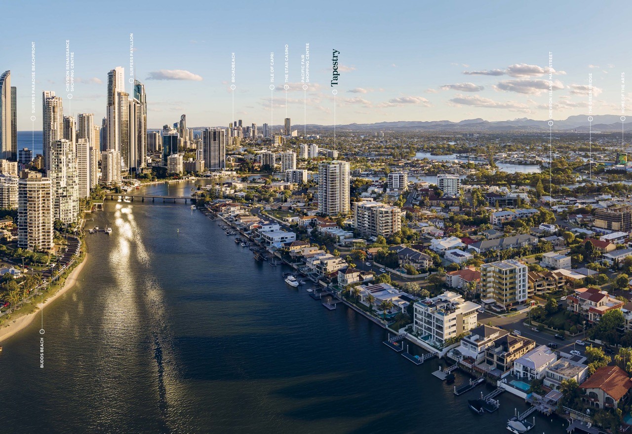 2 Bed + Study, 2 Bath, 96sqm Prices from AUD $1,099,9002 Bed,+ MPR, 2 Bath, 108sqm Prices from AUD $1,129,9003 Bed, 2 Bath, 142sqm Prices from AUD $1,739,900Commanding a signature position in the heart of Chevron Island, just minutes from the Gold Coast's renowned arts precinct, HOTA (Home of the Arts), Tapestry will stand as a striking new addition to the Surfers Paradise skyline. This iconic development offers a fusion of art, lifestyle, and modern living, capturing the essence of its vibrant surroundings.Completion Q2 2026The Perfect Blend of Urban and Cultural LivingTapestry comprises a visionary 22-level address, offering an inspired collection of spacious two and three-bedroom designer apartments. These residences are meticulously crafted to embrace the sophisticated coastal lifestyle while providing an unrivalled living experience. The apartments are designed to offer both style and functionality, with open spaces, stunning views, and luxurious finishes.Unrivalled Lifestyle AmenitiesTapestry residents will have access to an exceptional range of lifestyle amenities, including resort-style facilities and thoughtfully designed common spaces. These amenities are tailored to meet the needs of modern living, allowing you to relax, entertain, and enjoy all that Chevron Island and Surfers Paradise have to offer.Chevron Island: A Cultural and Artistic HubChevron Island, connected to Surfers Paradise by the Green Bridge, is a vibrant extension of the Gold Coast's arts and culture precinct. As the home of HOTA, this area is buzzing with artistic expression, cultural events, and community activities. The area's cosmopolitan atmosphere blends the best of the city, arts, and beach lifestyles, making it a unique and desirable location to live.Chevron Island offers an exceptional lifestyle that combines the creativity and culture of HOTA, the vibrancy of the city, and the laid-back beachside lifestyle the Gold Coast is famous for. With its prime location, Tapestry provides the perfect setting for those seeking a cosmopolitan and dynamic way of life, where art, culture, and the beach converge seamlessly.Whether you're drawn to the thriving arts scene, the modern urban environment, or the beautiful beaches, Tapestry on Chevron Island offers a unique opportunity to be a part of this exciting new chapter in the Gold Coast’s cultural landscape.FeaturesResidents Co-WorkingMeeting Room Garden room PoolSpaHealth & WellnessGymOutdoor ShowerVegetable GardenBBQsLawnPrivate Dining Room Underground secure car parking