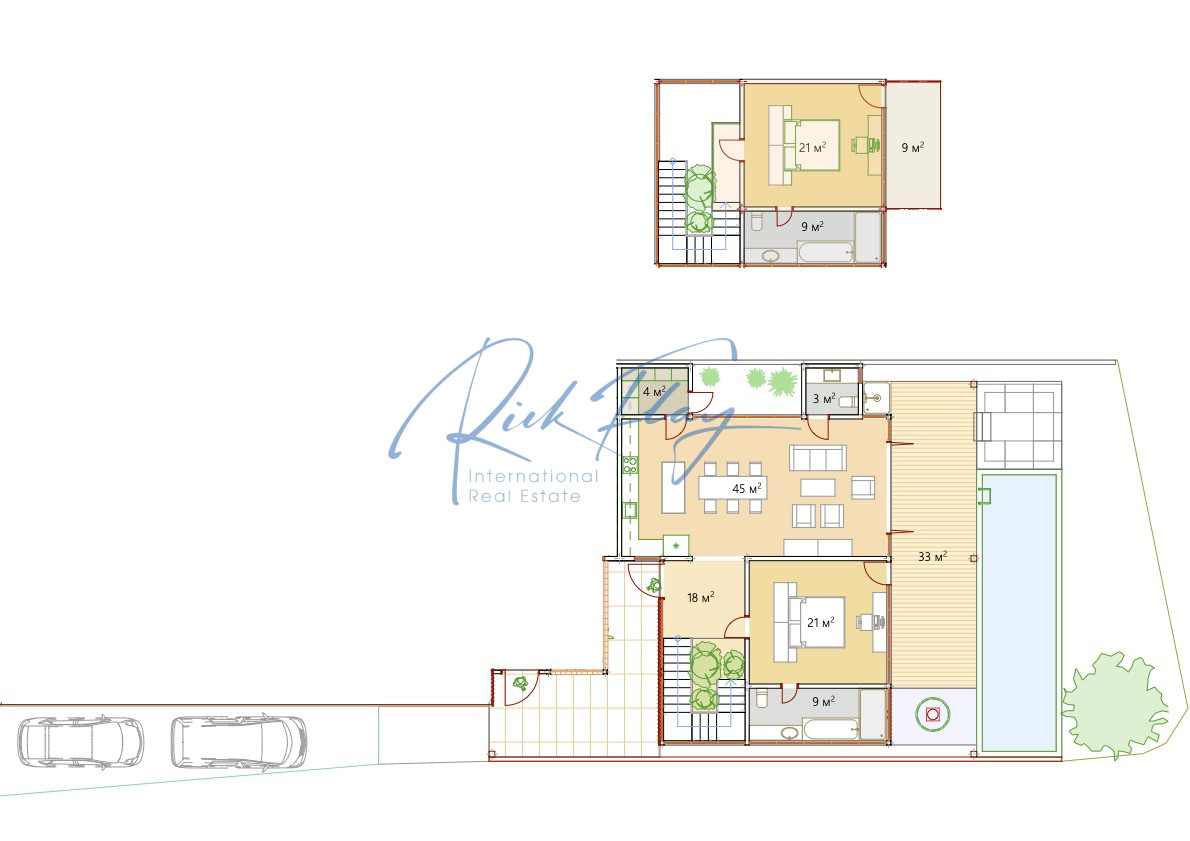 Spacious two-story villas located on the top of a hill. It features an open jungle view that will never be blocked. Perched on a hilltop, this stylish villa features rooms with varying ceiling heights, natural stone tiles and premium wood parquet flooring and furniture, marble table tops, tropical open shower and large pool and landscaped courtyard, and of course, stunning views of the jungle and sunset.