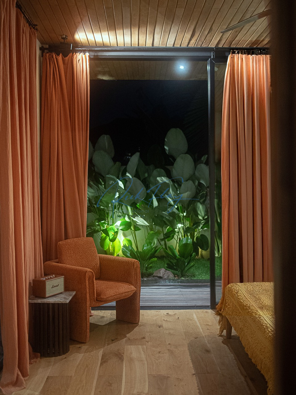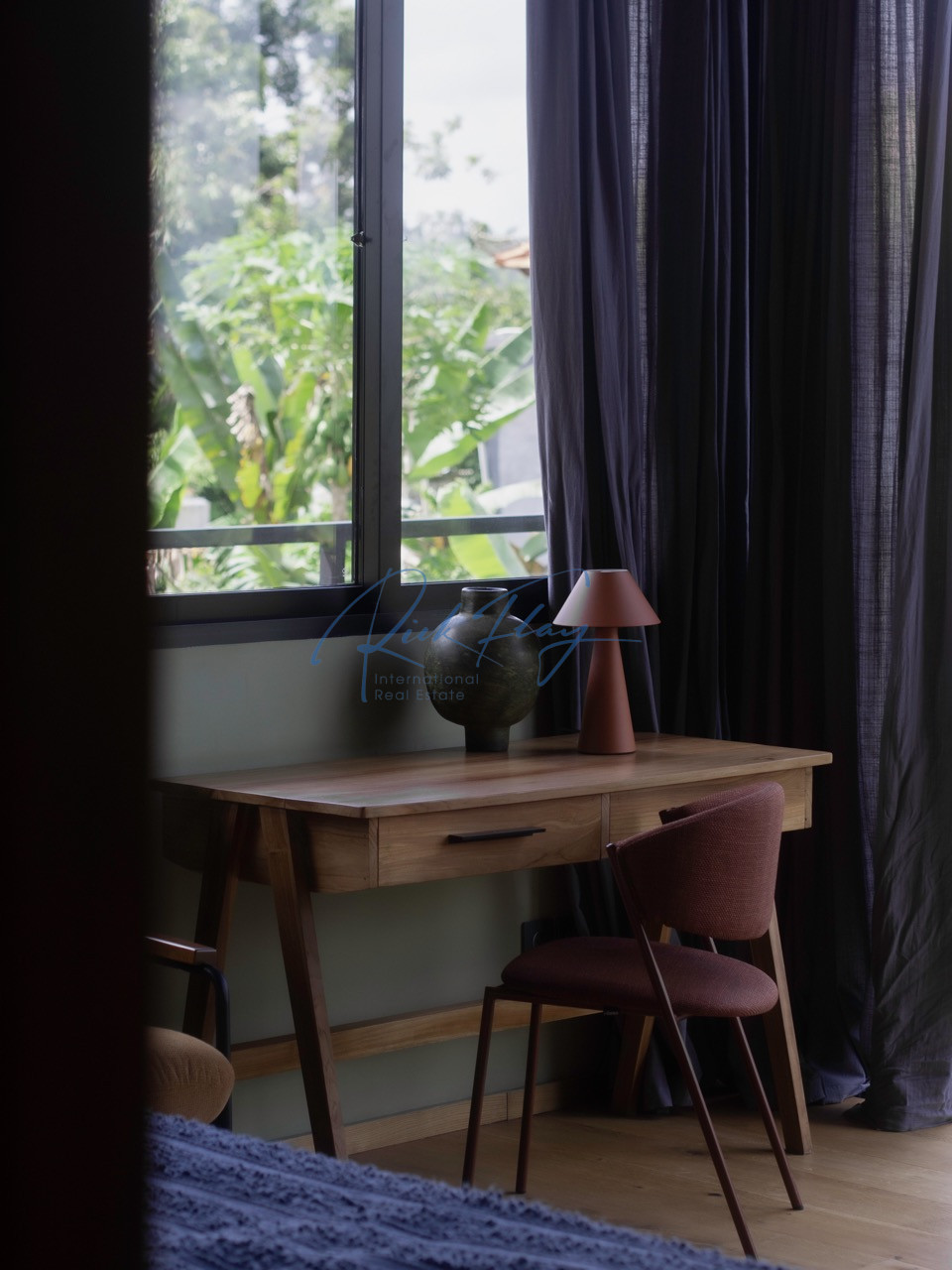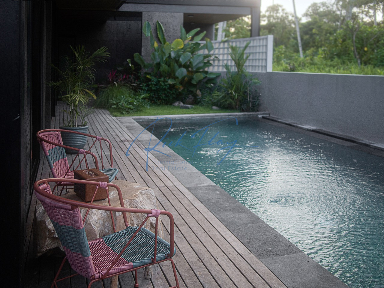 Spacious two-story villas located on the top of a hill. It features an open jungle view that will never be blocked. Perched on a hilltop, this stylish villa features rooms with varying ceiling heights, natural stone tiles and premium wood parquet flooring and furniture, marble table tops, tropical open shower and large pool and landscaped courtyard, and of course, stunning views of the jungle and sunset.
