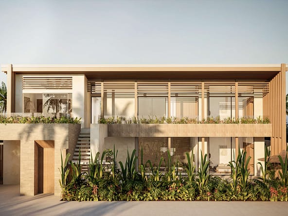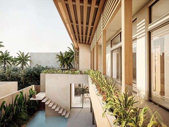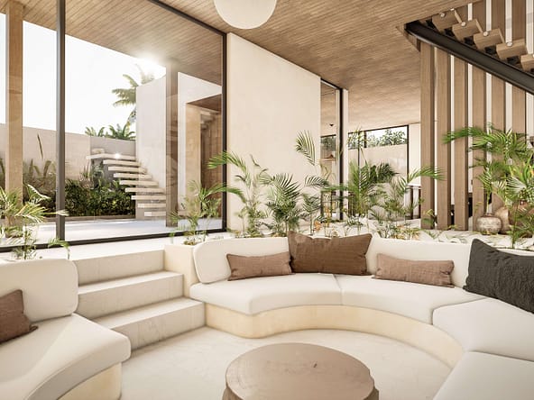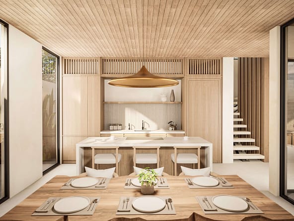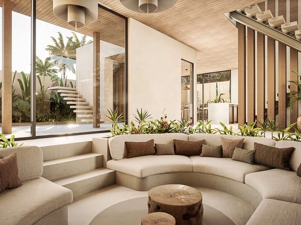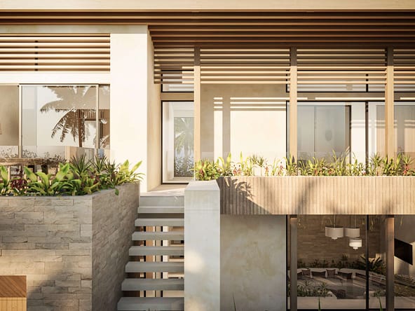 The four-bedroom villa’s living room centers around a spacious sunken seating area, complemented by lush perimeter planting and a striking feature stone wall. A sleek steel-stringer staircase adds a bold architectural statement, seamlessly enhancing the villa’s refined aesthetic.