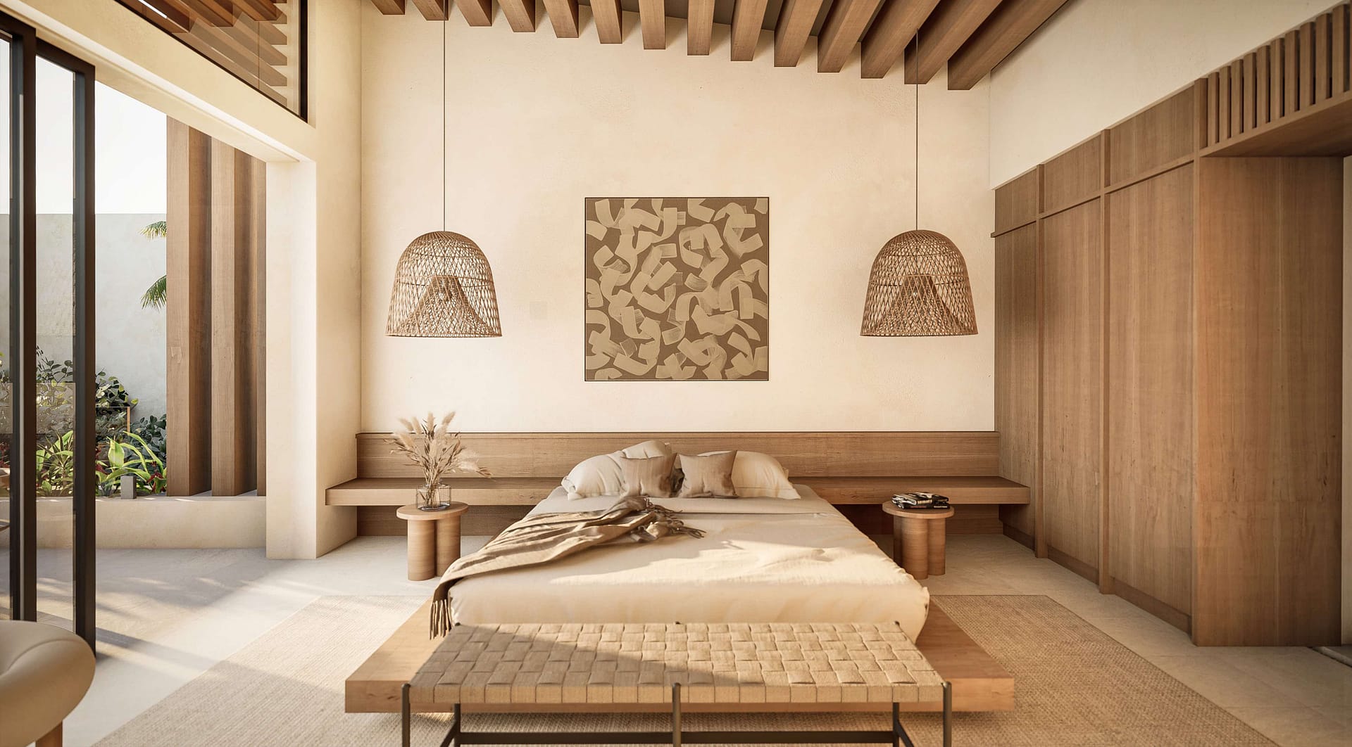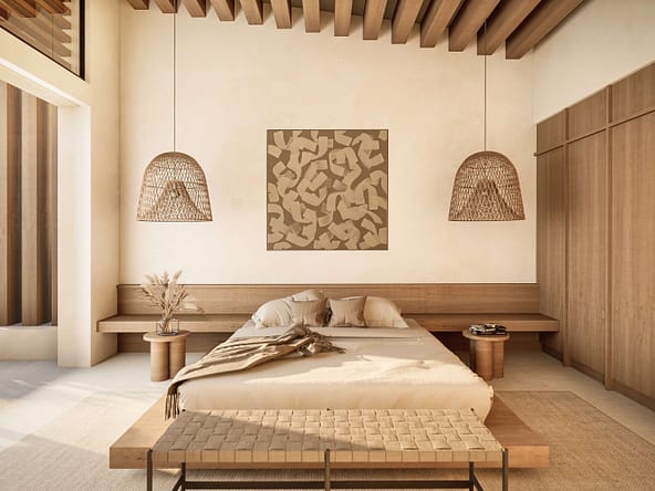 The master bedroom exudes luxury with its cool, mid-century modern allure. Warm tones, a timber-clad headboard, teak furniture details, and honed concrete flooring create a refined and sophisticated atmosphere. The fusion of these natural elements crafts an elevated environment that embodies the essence of upscale living.