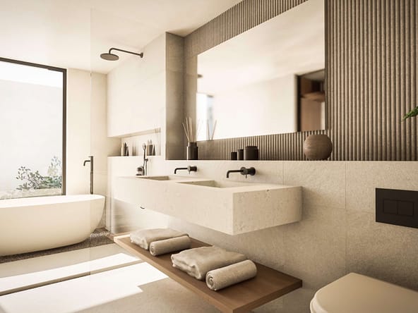 The en-suite bathrooms are designed as private sanctuaries, featuring natural stone accents and a contemporary feature wall. This blend of nature and modern design creates a serene environment, while modern amenities ensure complete comfort.