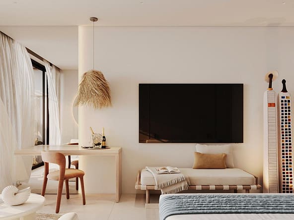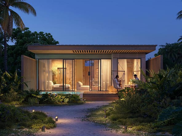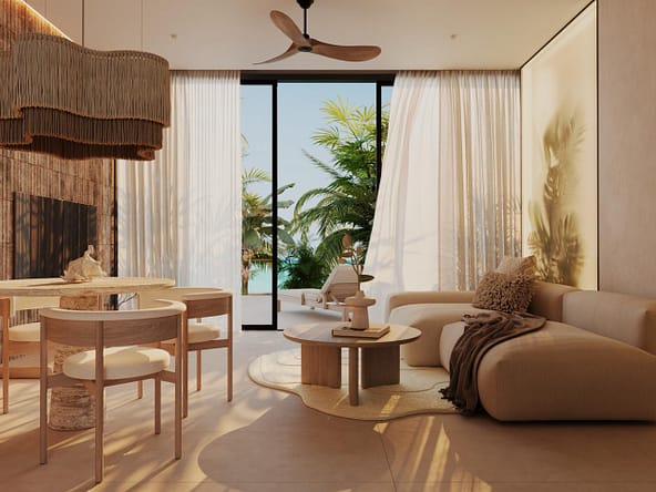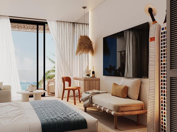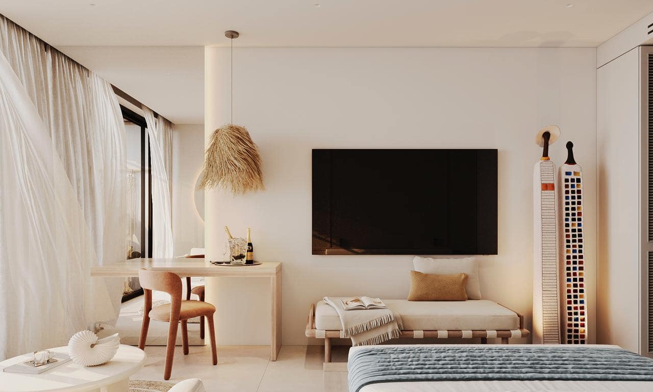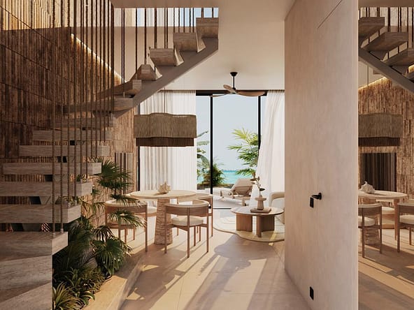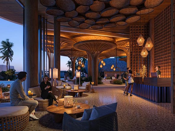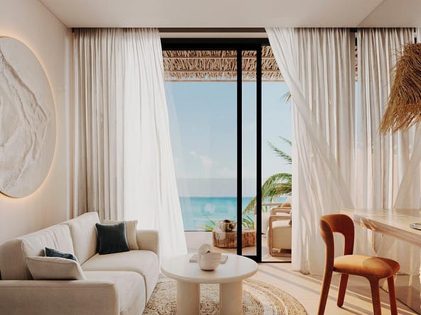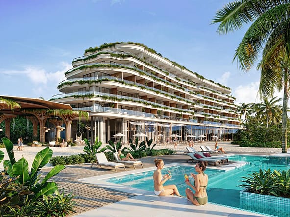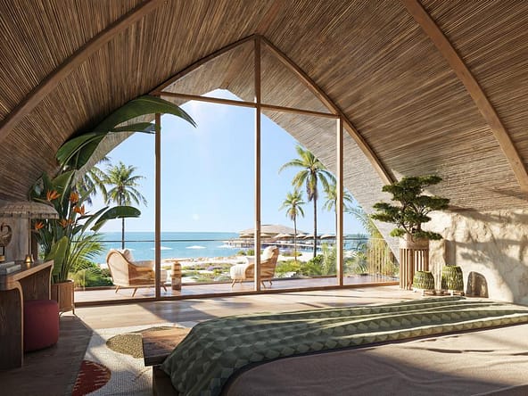 The project offers full upscale resort infrastructure including a panoramic ocean-view restaurant, lobby bar and co-working space, SPA complex, fitness and outdoor yoga areas, kids zone, lounge and entertainment spaces, cinema and media room, conference facilities, as well as unique concepts such as a floating restaurant and floating SPA over water.
